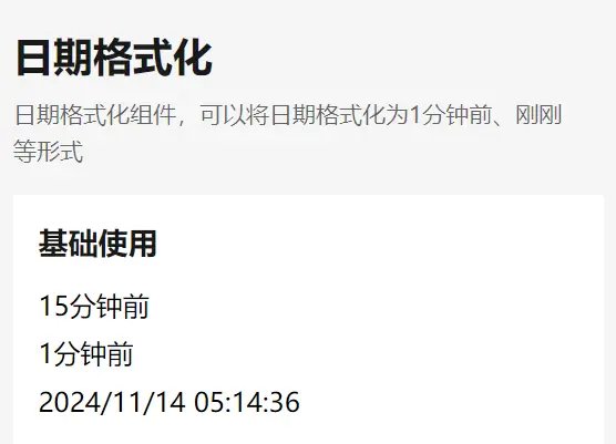 一个功能丰富的日期格式化组件,用于将日期转换为多种格式。支持将日期格式化为标准格式或相对时间(如"刚刚"、"几分钟前"等),可用于文章发布时间、评论时间、消息时间等多种场景。组件提供了丰富的自定义选项,可以满足各种日期展示需求。