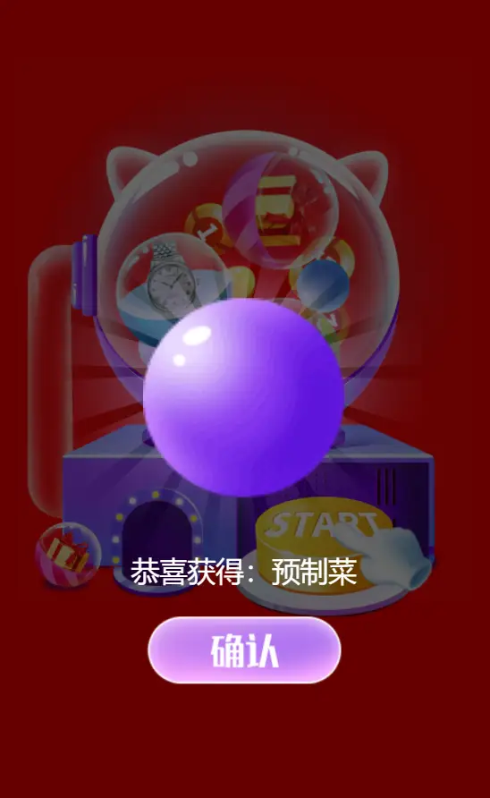 | giftImgList | Array | 抽奖机里显示的扭蛋图片,一共13张图,如果需要替换扭蛋图片,按照顺序传递图片地址可依次替换: 0 - 2:礼物、手机、手表 3 - 7:数字球1 - 数字球5 8 - 9:紫球 10 - 11:蓝球 * 12:金蛋 |