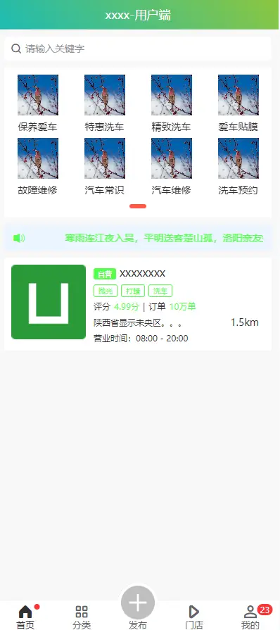 首页,个人中心,发布页面,添加爱车,用户信息,店铺详情,分类,门店列表,评价列表,添加评论,用户信息