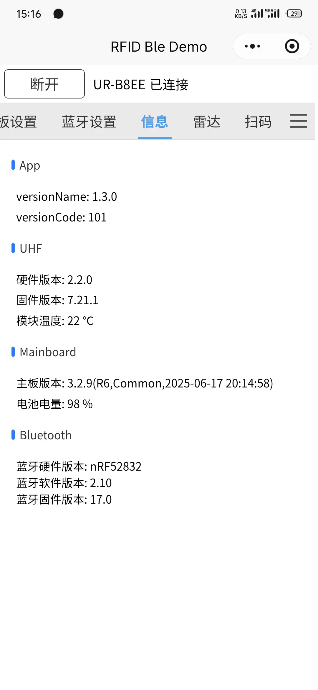 适配多天线设备(如R3); 添加蓝牙参数相关接口(要求蓝牙版本V2.10+); Demo优化页面;