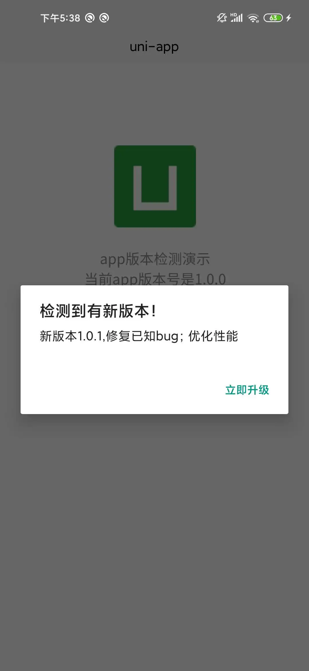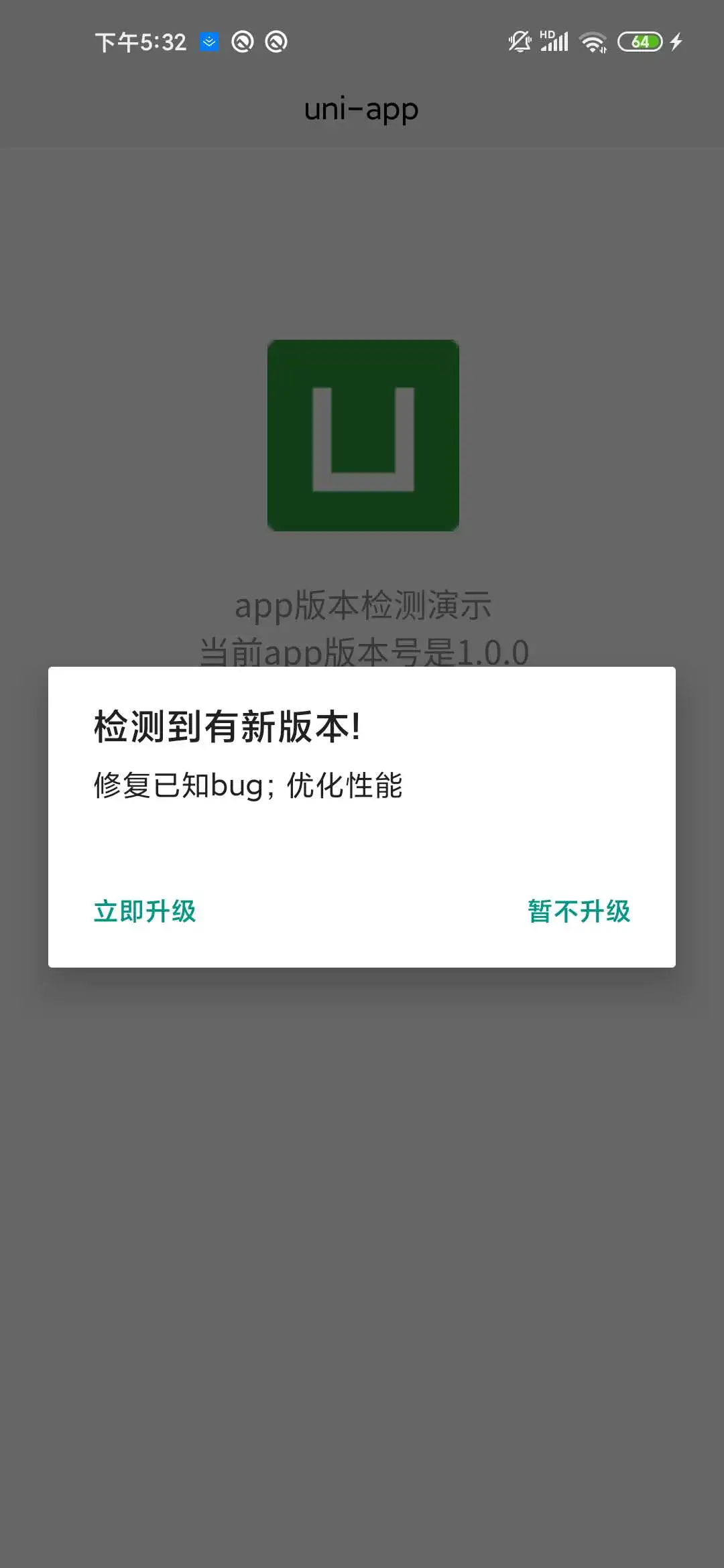 //调用示例 配置参数, 默认如下,其中api是接口地址,必须填写 // #ifdef APP-PLUS checkappupdate.check({ title:"检测到有新版本!", content:"请升级app到最新版本!", canceltext:"暂不升级", oktext:"立即升级", api:'http://exam.wonyes.org/update.php', barbackground:"rgba(50,50,50,0.8)",//进度条背景色,默认灰色,可自定义rgba形式色值 barbackgroundactive:"rgba(32,165,58,1)"//进度条前景色色,默认绿色,可自定义rgba形式色值 }) // #endif -
