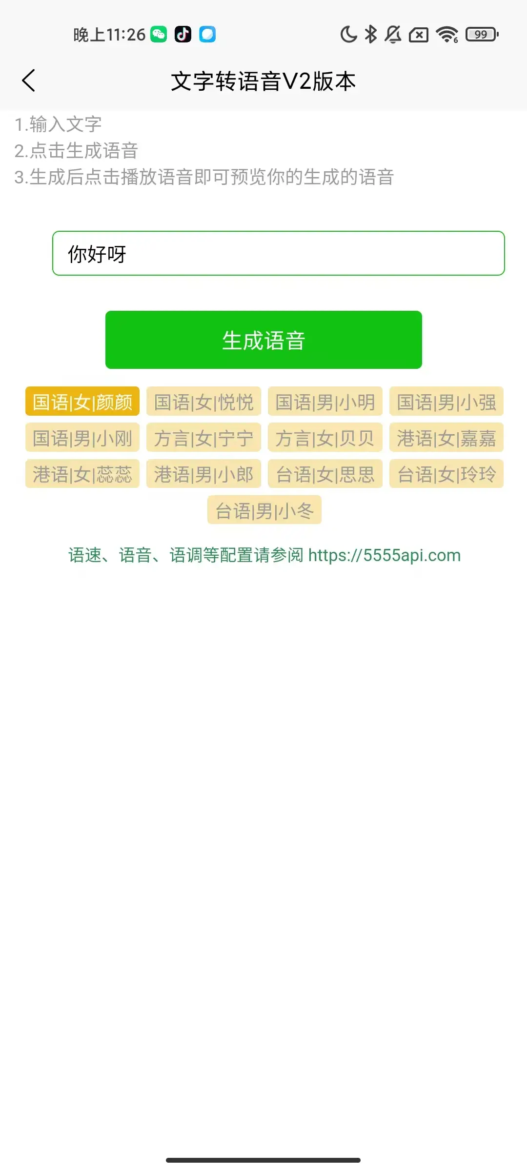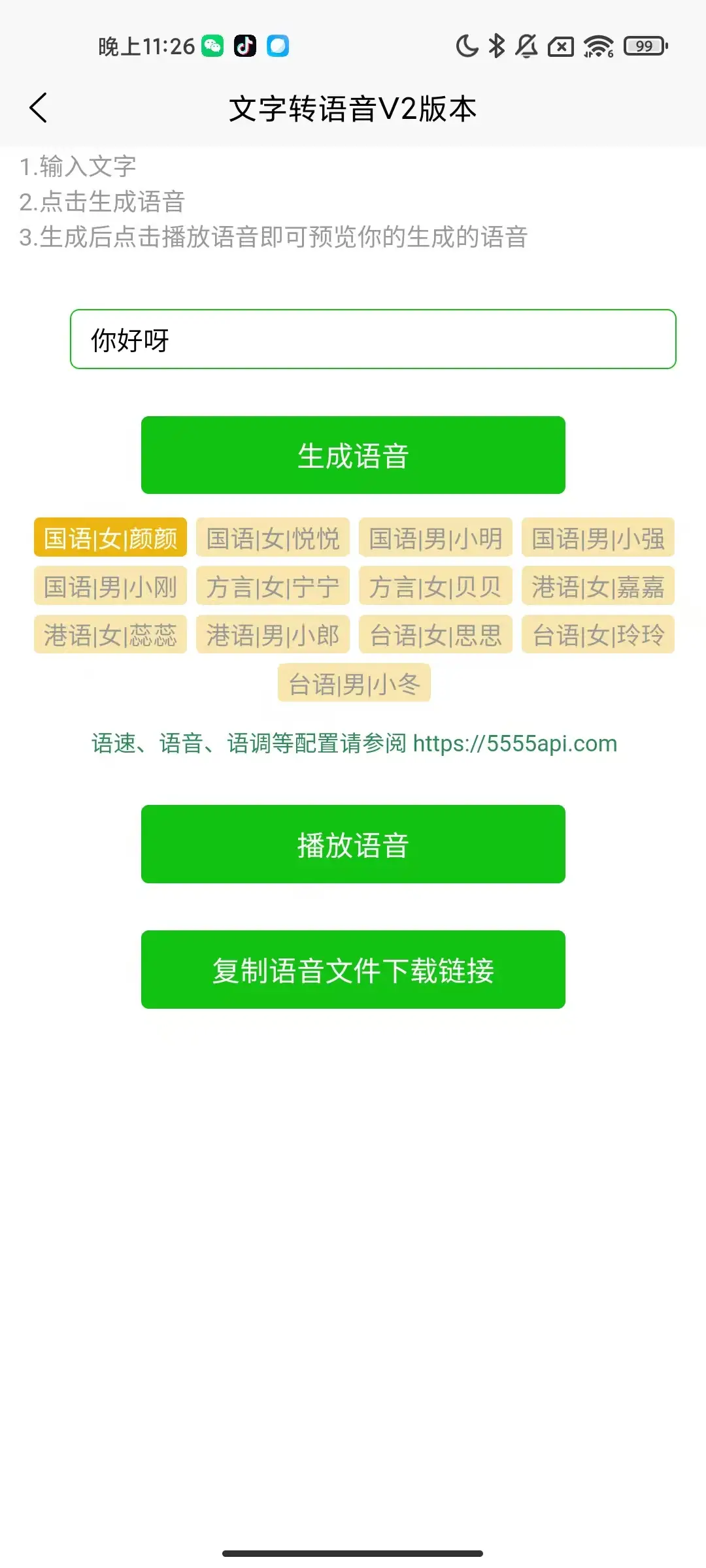 <view class="tip">语速、语音、语调等配置请参阅 https://5555api.com</view>
