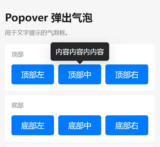 气泡支持多种弹出位置,可以根据需要设置。通过 placement 属性来控制气泡的弹出位置。可选项:top/left/right/bottom/top-left/top-right/bottom-left/bottom-right/left-top/left-bottom/right-top/right-bottom