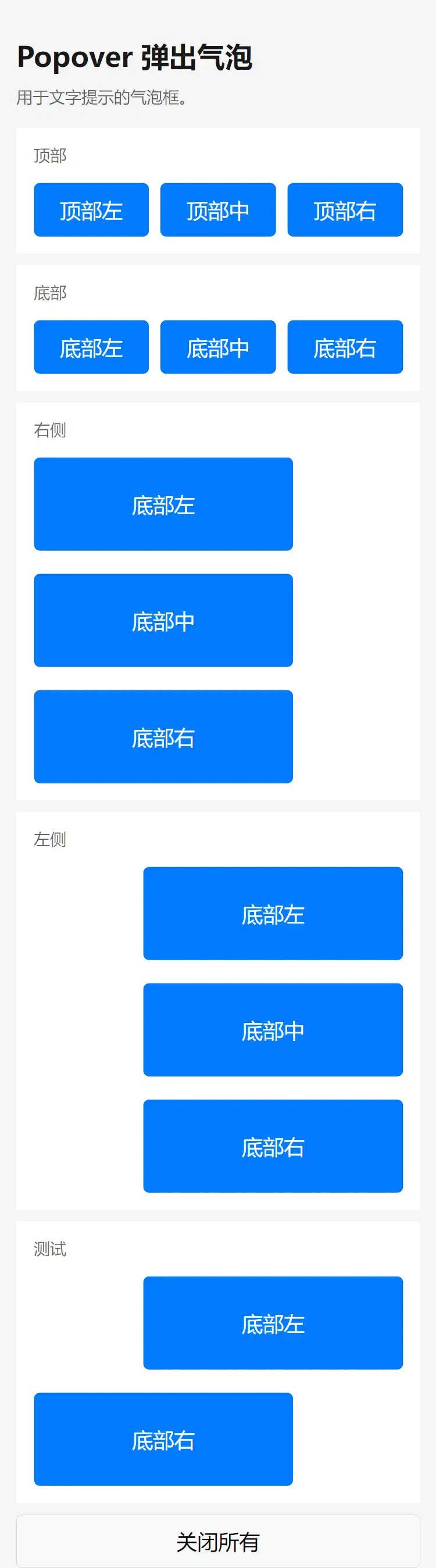 一个功能丰富的气泡弹出框组件,用于在元素周围显示提示信息、菜单或其他内容。支持多种弹出位置、主题样式、箭头显示等配置,可用于提示说明、操作菜单、详细信息展示等多种场景。组件提供了丰富的自定义选项,可以满足各种气泡弹出框需求。