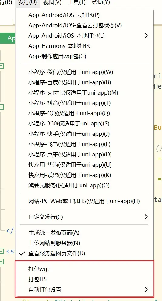 - 在菜单栏中点击 发布 -> 打包wgt/打包h5。