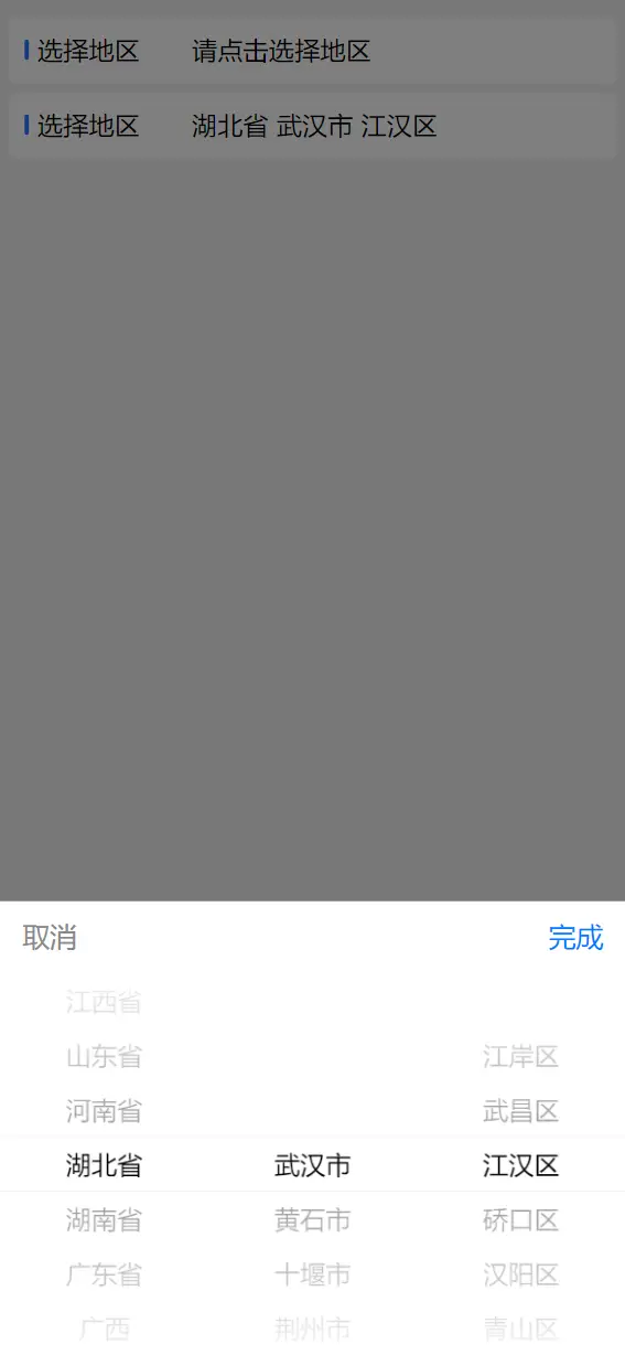 如: region1: "请点击选择地区", region2: "湖北省,武汉市,江汉区" -
