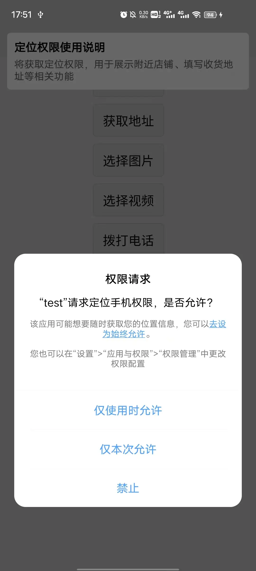 注意:HBuilderX 4.01 Vue2项目需要使用自定义基座测试监听权限申请的功能,标准基座暂不支持测试。