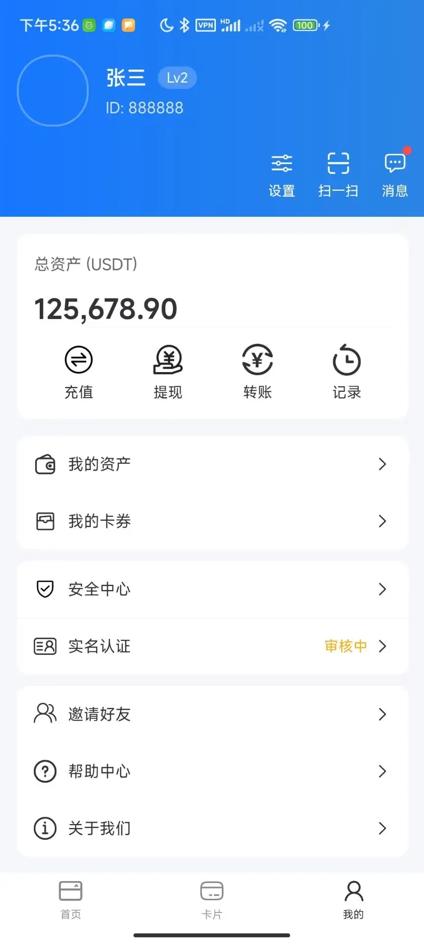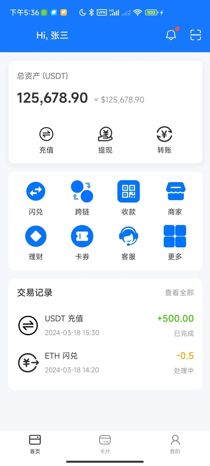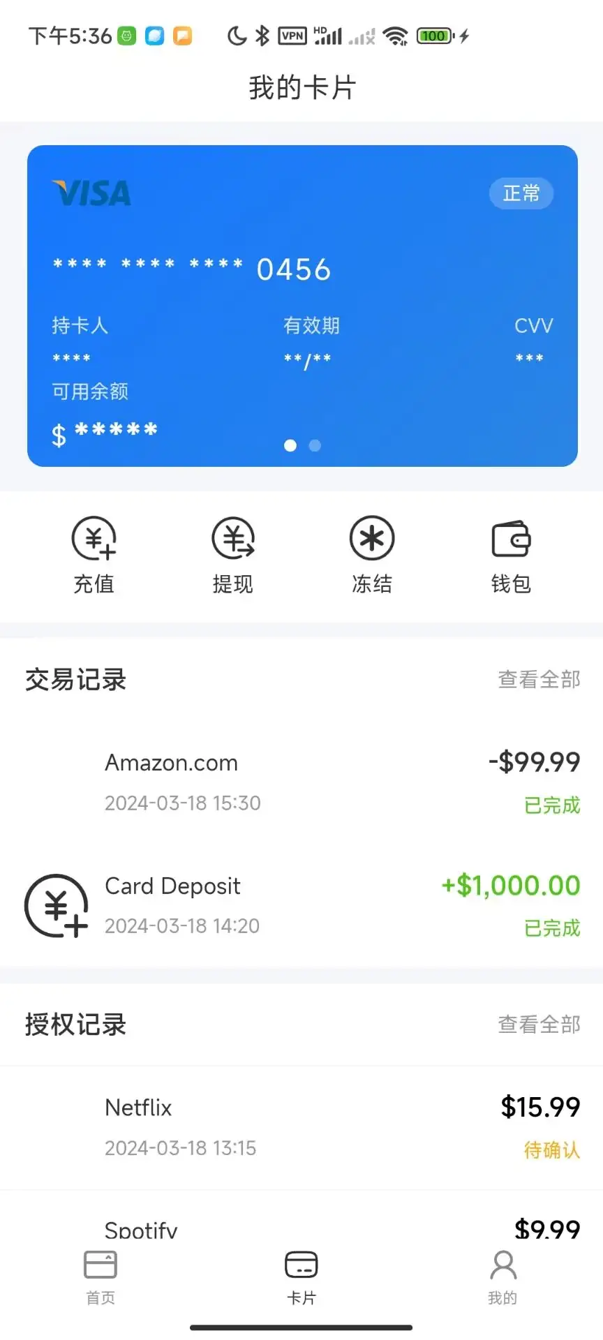 - 【卡片页面】支持连接其他钱包,交易记录,授权记录,冻结,卡片信息。