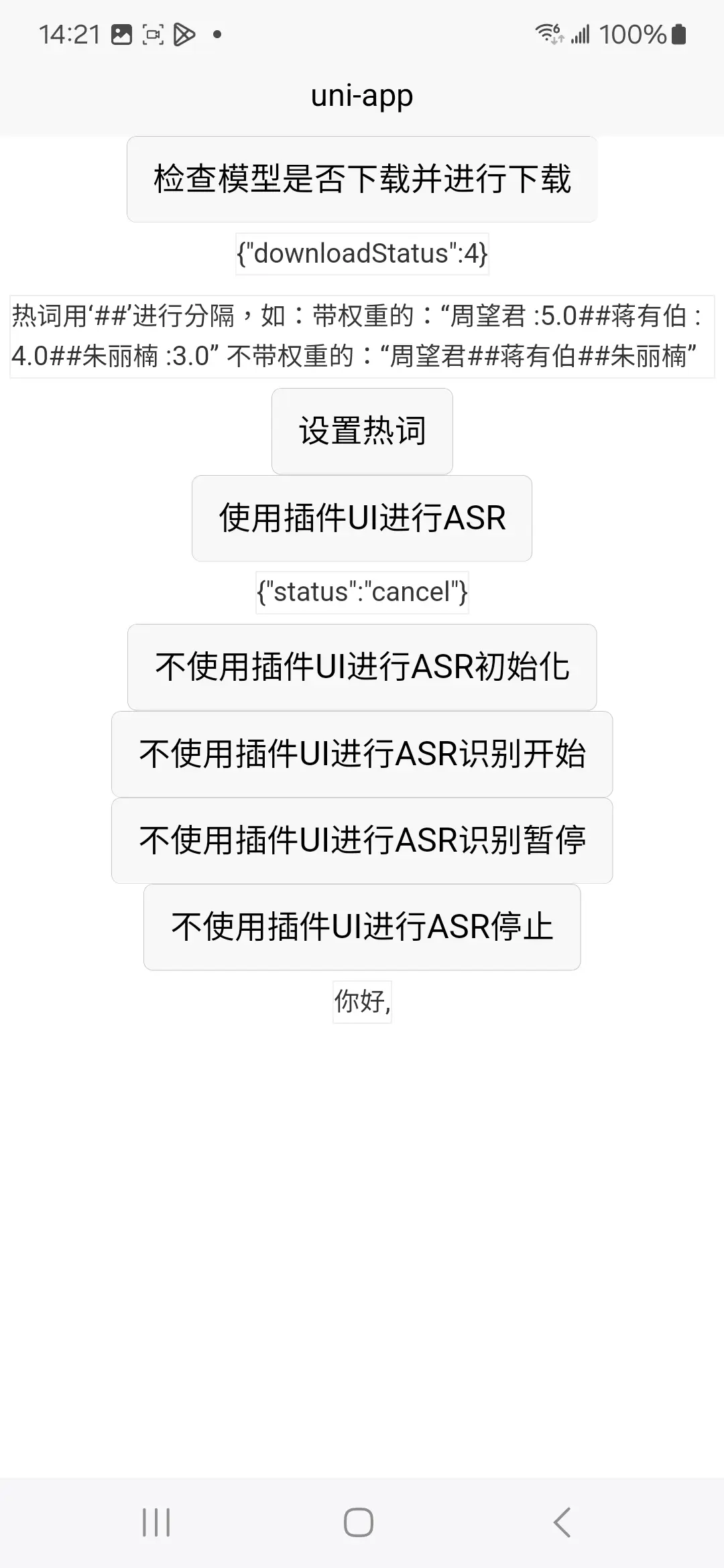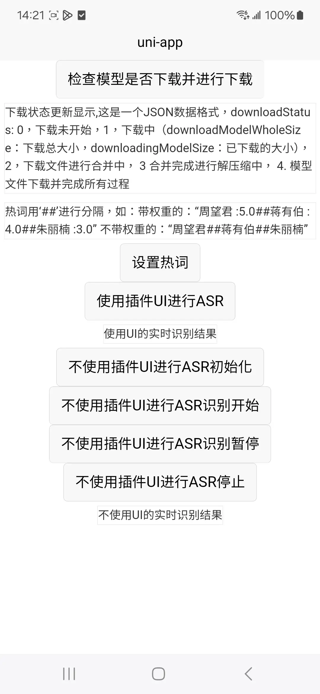import {ASROptions,checkDownloadModels,getDownloadModelStatusInfo,asrSetHotwords,asrRecognizeWithUI,asrRecognizeWithoutUIInit,asrRecognizeWithoutUIStart,getASRWithNoUIResult,asrRecognizeWithoutUIStop,asrRecognizeWithoutUIDestory} from "@/uni_modules/zz-asr-recognize"