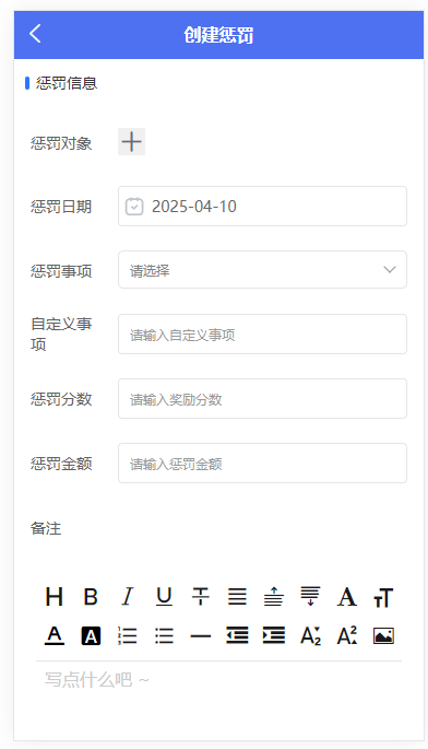 创建惩罚事项 POST/api/Punishments/createPunishments 创建惩罚事项填写各种信息