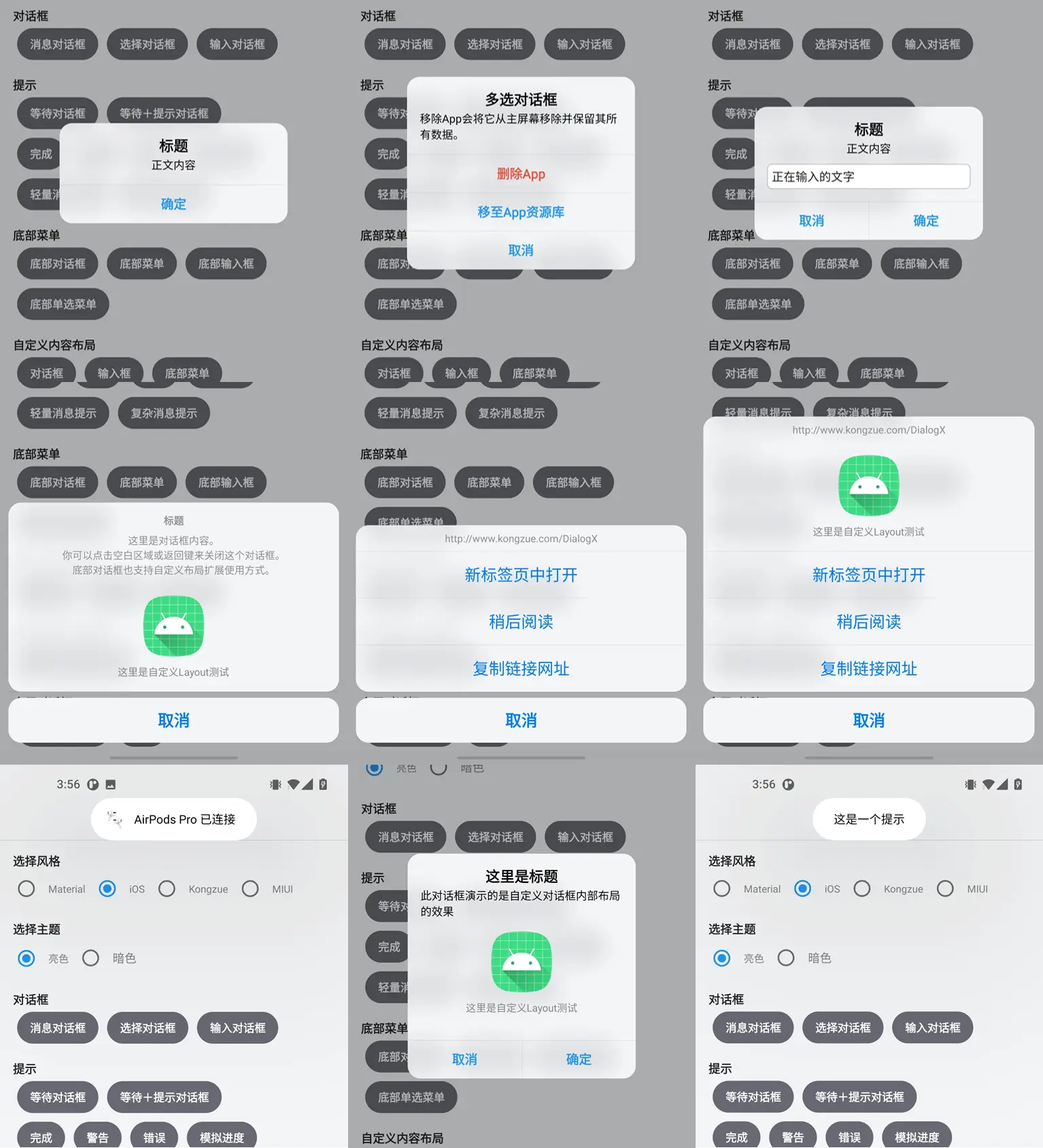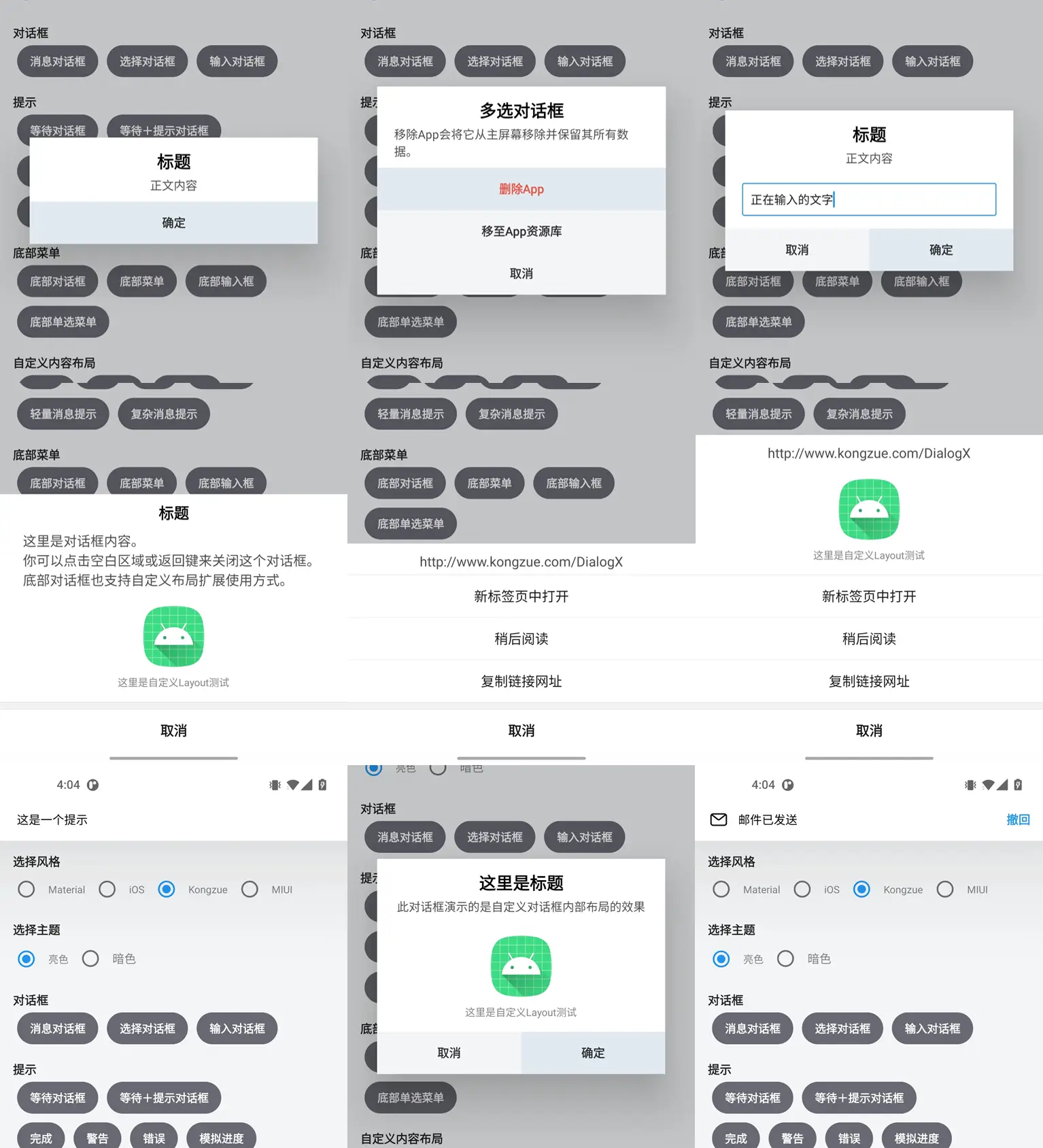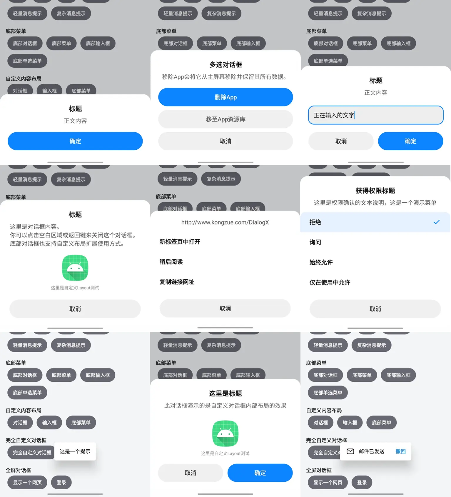 - 【新增】对话框,菜单对话框,提示,通知/消息通知,菜单,底部对话框,底部菜单