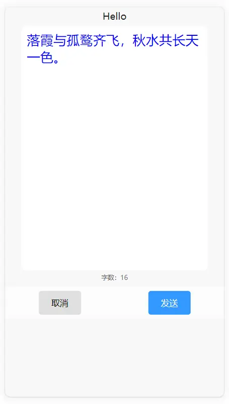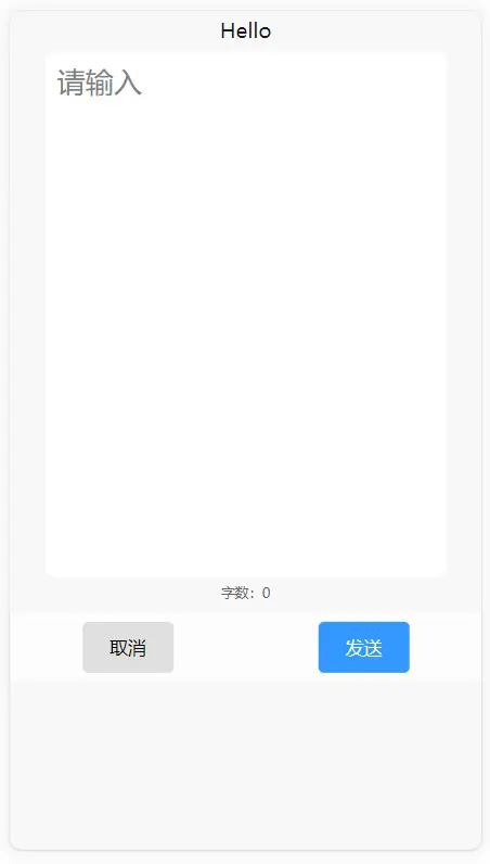 <hy-fullscreen-input id="id123" @send="get" :title="title" :show.sync="show1" btn2Text="发送" fontColor="blue" inputSize="25" :showFontnum="true"></hy-fullscreen-input>
