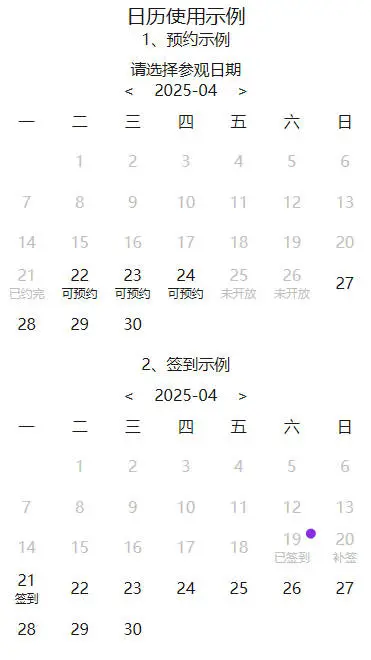 更新 1.1.0版本 更新内容: 1.增加支持日历月份前后切换,不再只展示当前月份和下个月 2.增加支持限制最小月份 最大月份,默认不限制