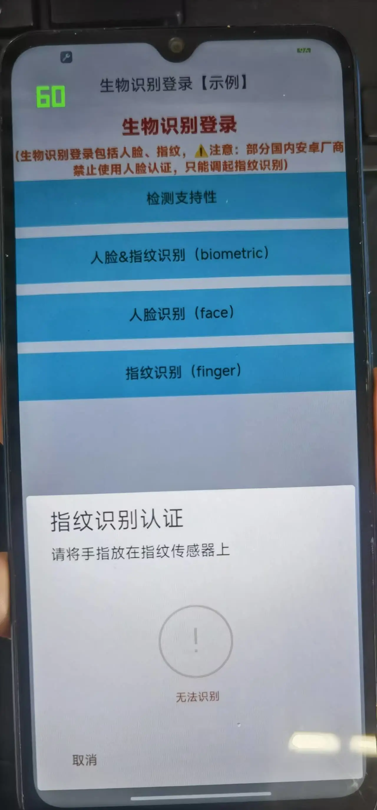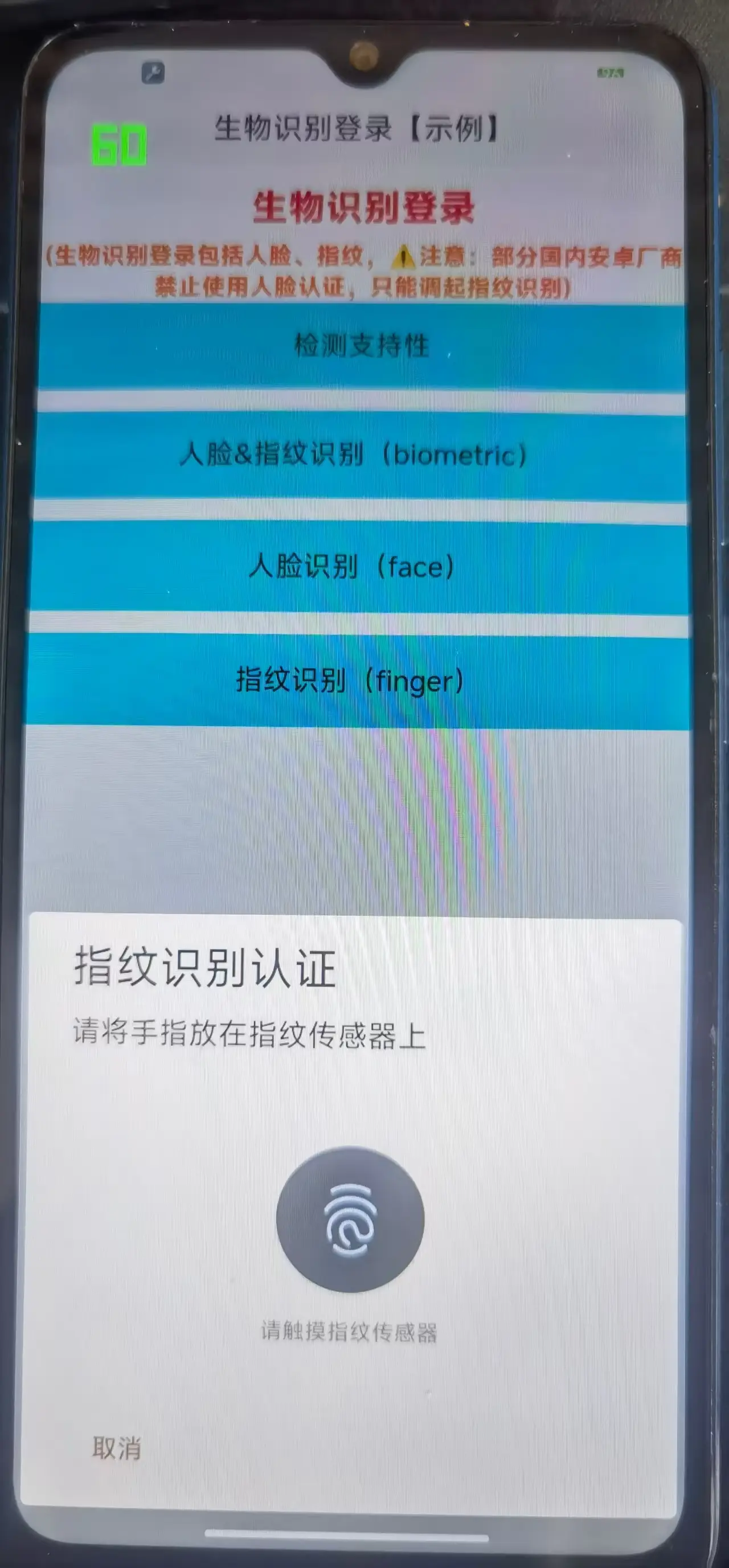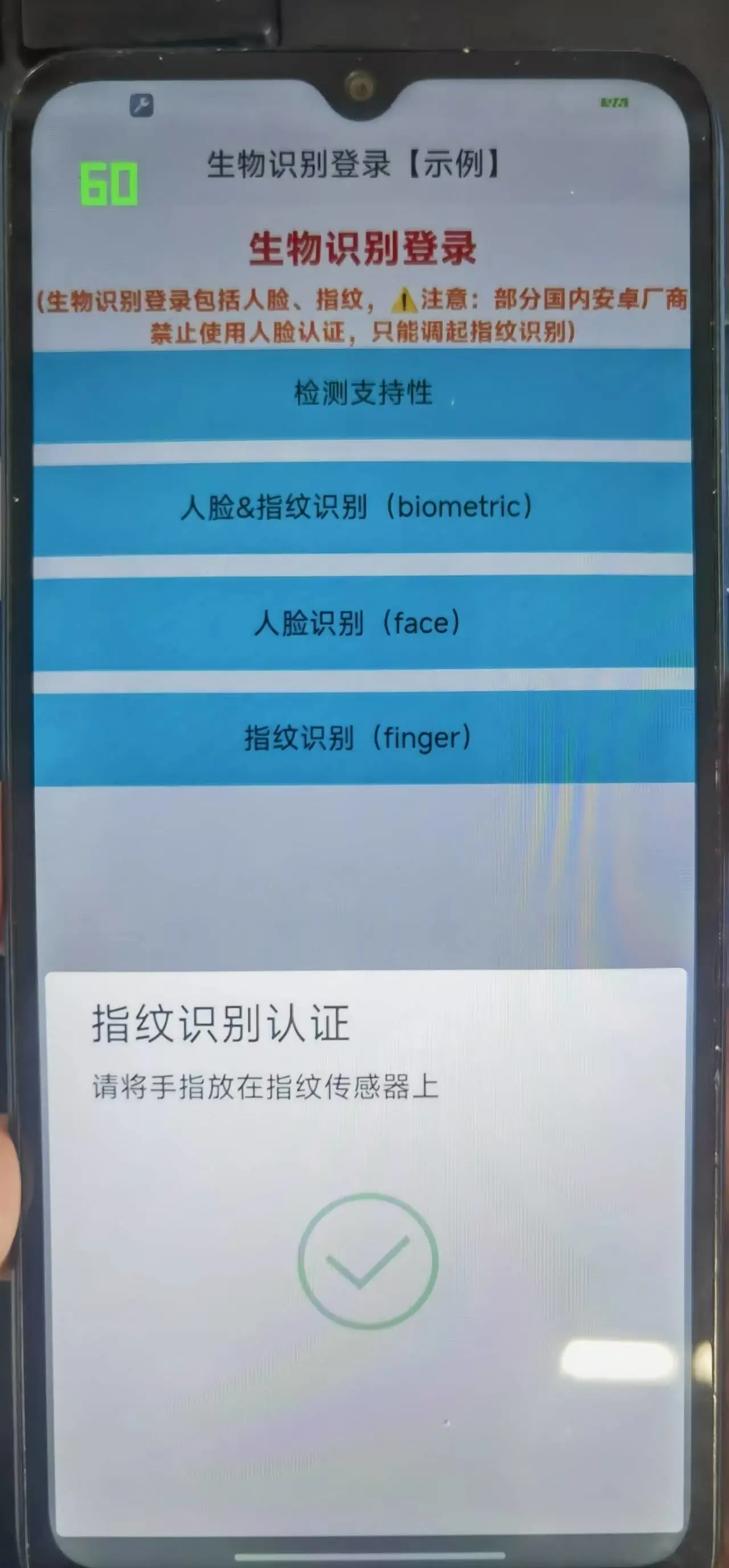 <view class="content-message">(生物识别登录包括人脸、指纹,⚠️注意:部分国内安卓厂商禁止使用人脸认证,只能调起指纹识别)</view>
