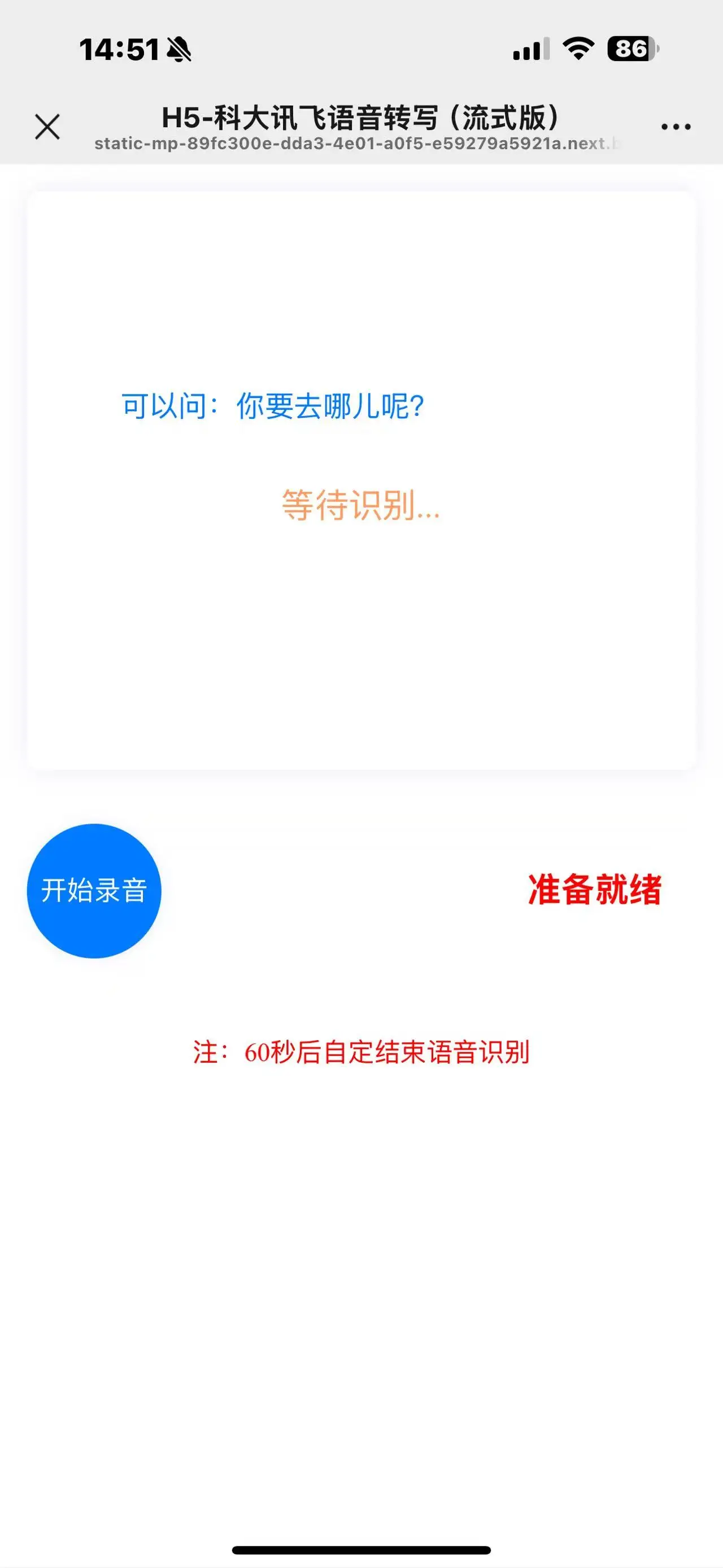 开箱即用,对60秒录音进行识别实时转写,快速准确识别,可应用于语音消息转写等场景。