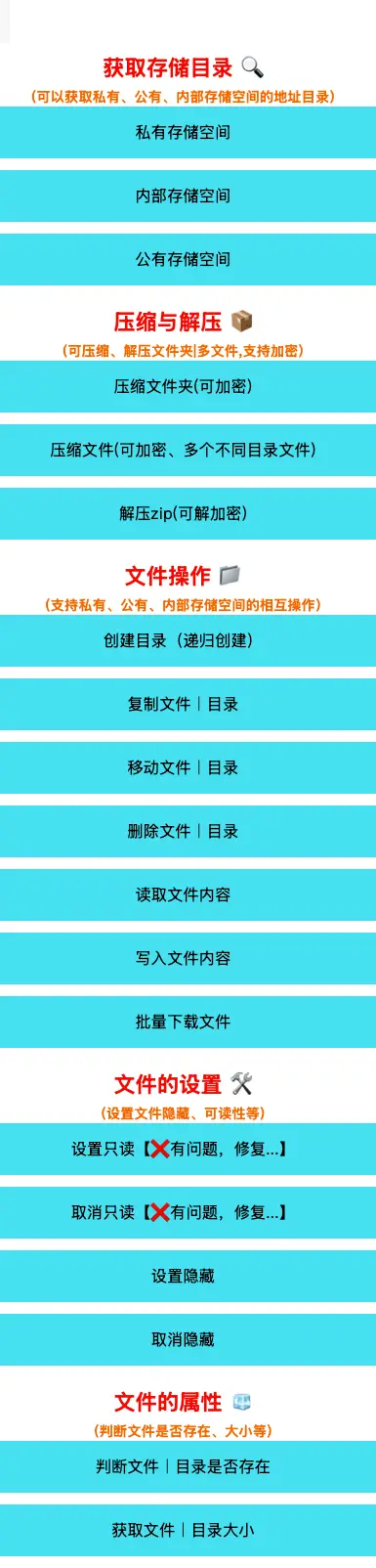initFilePermission,getAppPath,getPrivatePath,getPublicPath,zipFolder,zipFiles,zipDecompress,createPath,copyPath,movePath,deletePath,setReadOnly,setHide,checkPath,pathSize,readFile,writeFile,downloadFile等方法 setReadOnly方法还存在些许问题,正修复中(若修复不了,后期可能删除)- 初始版本