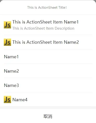 ActionSheet项目Array.<object> object{name:string,desc:string,color:string,size:string|number,icon:string}. 当网格为false时 desc无效 |