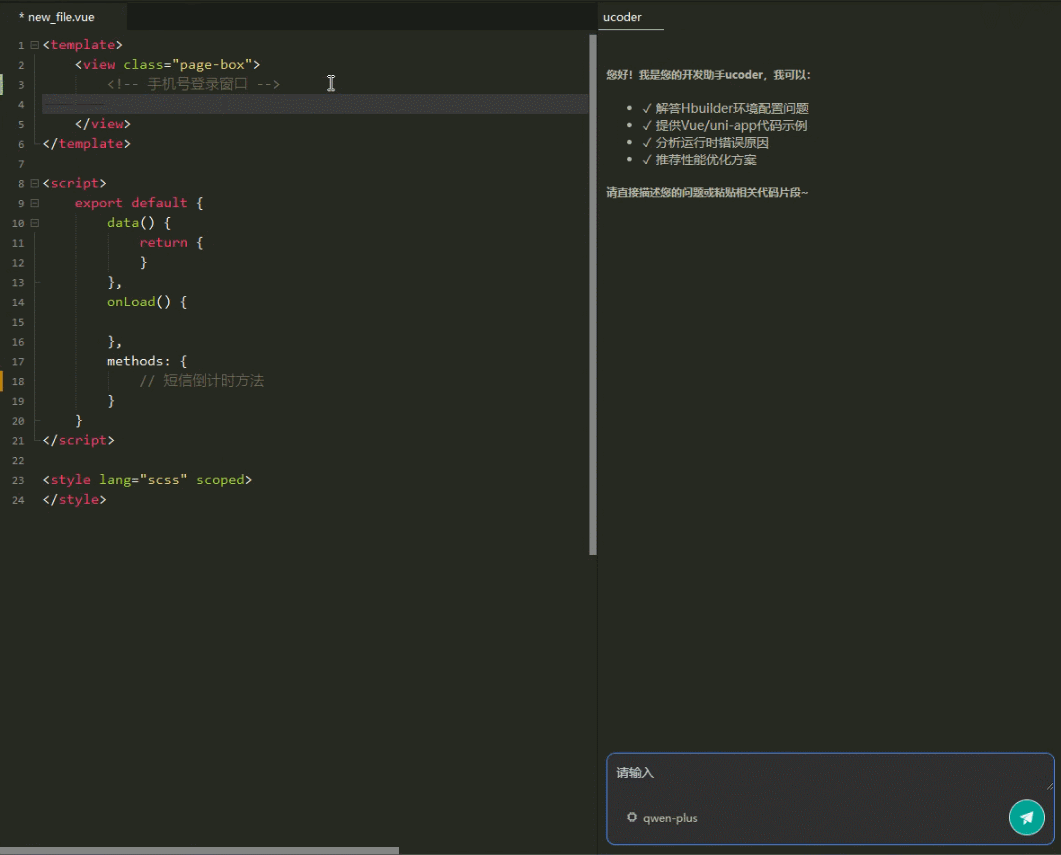 ucoder 是专为 HBuilderX 设计的 AI 智能编程助手插件,基于大模型技术提供代码补全、生成、问答、调试等全方位编码辅助,显著提升开发效率。