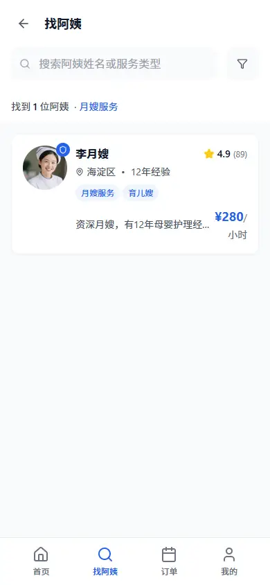 - 浏览服务人员:在首页或列表页选择合适的家政人员