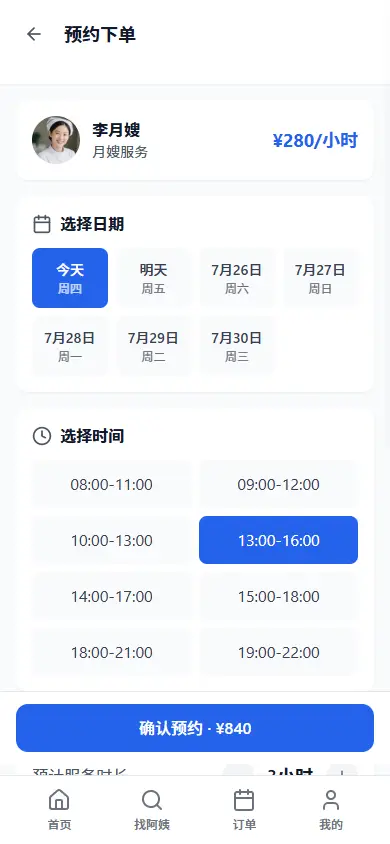 - 填写信息:选择服务时间、地址,填写特殊需求