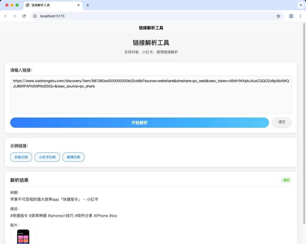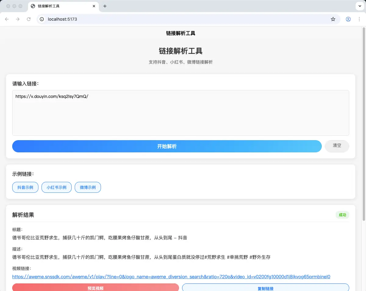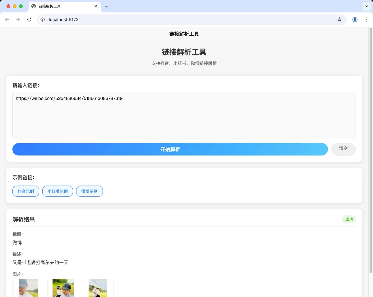 - ✅ 支持抖音、小红书、微博链接解析