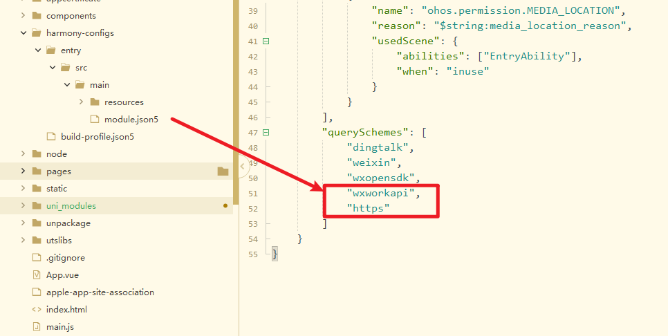 - 在harmony-configs/entry/src/main/module.json5的 "module"下增加 "querySchemes": ["wxworkapi","https"]