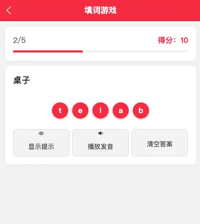 - 单词学习系统:支持新词学习、复习模式、拼写练习等多种学习方式