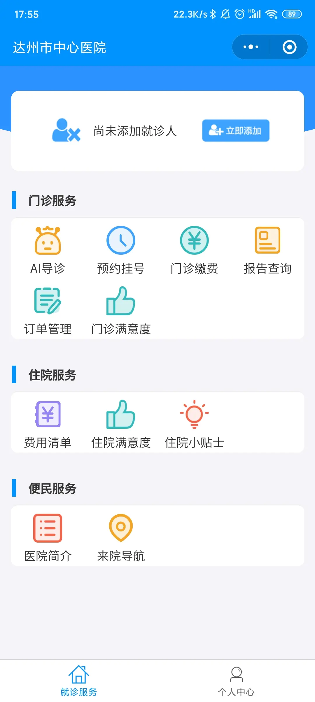 医院就诊服务-VUE模板 布局、样式、JS分离 尚未添加就诊人 门诊服务 住院服务 便民服务 AI导诊 预约挂号 门诊缴费 报告查询 订单管理 门诊满意度 费用清单 住院满意度 住院小贴士 医院简介 来院导航