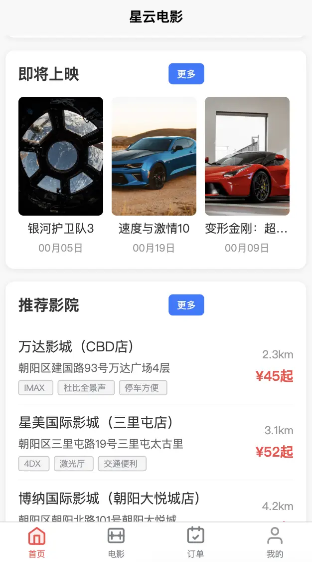 - 影院查询系统:支持附近影院搜索、影院详情查看、排片信息展示