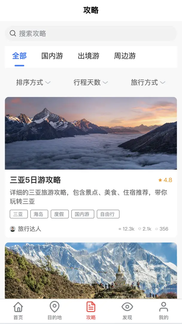 - 攻略页面:支持分类筛选、排序方式、行程天数、旅行方式等多维度筛选