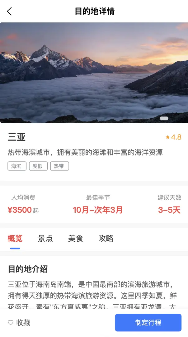 - 目的地页面:支持多条件筛选(排序方式、目的地类型、行程天数)