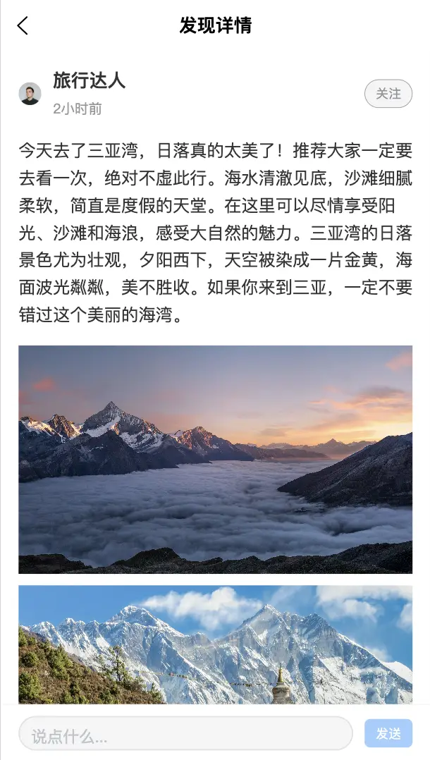 - 发现页面:旅游内容发现和详情查看