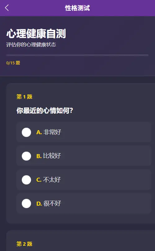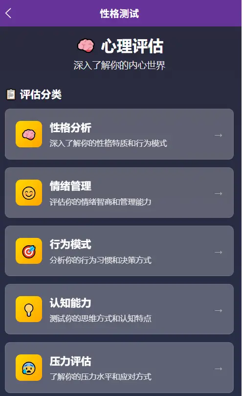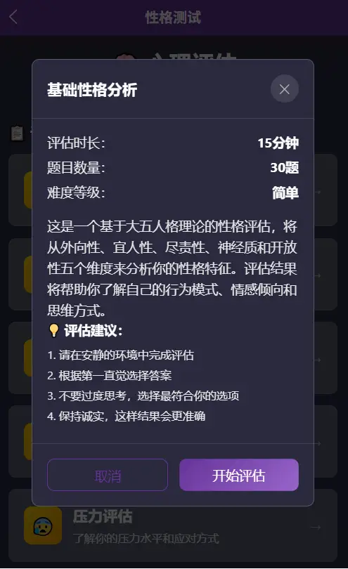 心理健康测评 - 15题专业问卷,全面评估心理状态 MBTI 性格测试 - 20题标准测试,探索你的性格类型 情感关系分析 - 12题深度评估,了解你的情感模式