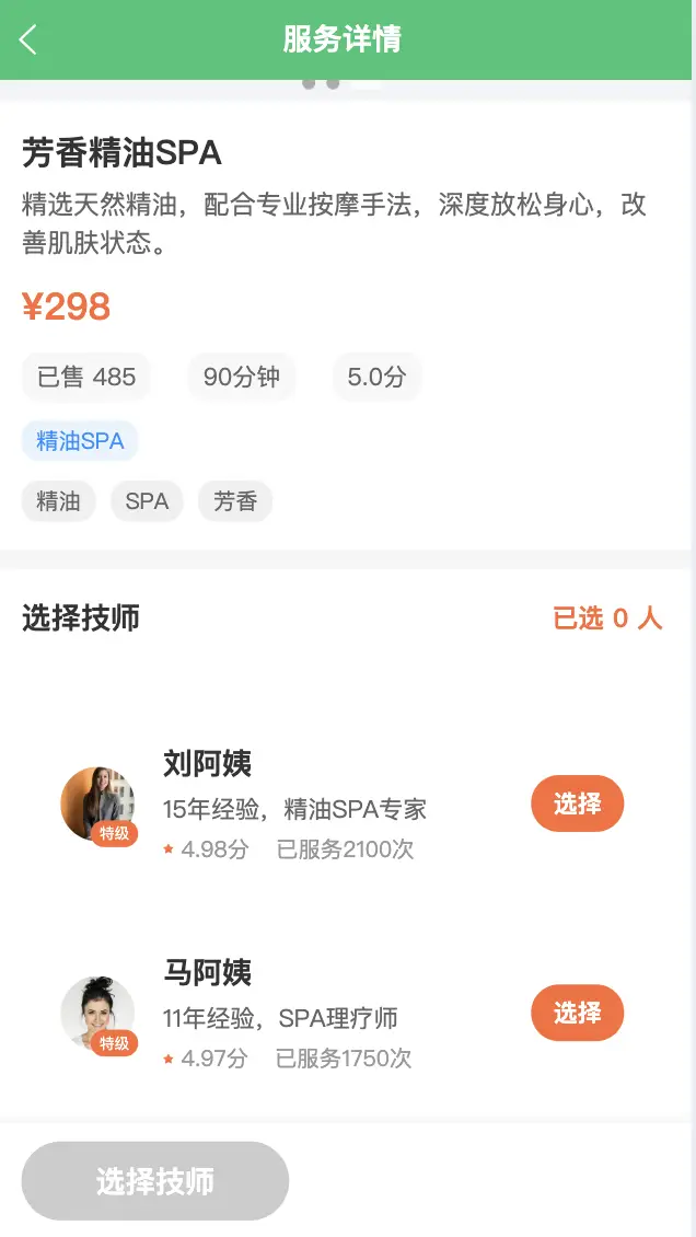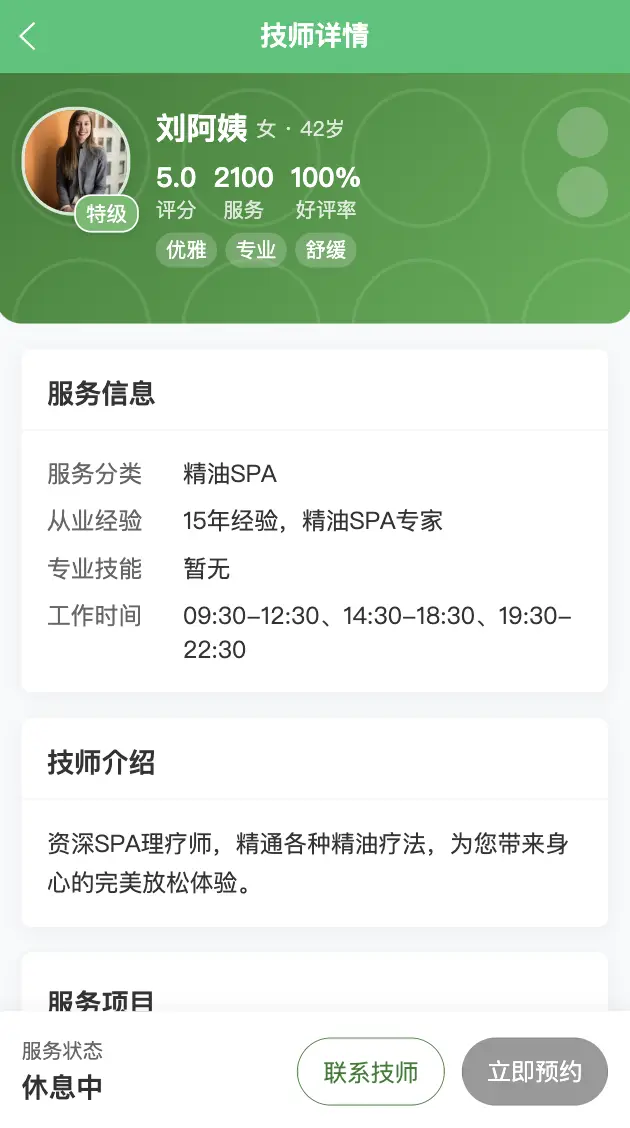 - 按摩师详情:展示按摩师信息、服务项目、用户评价等