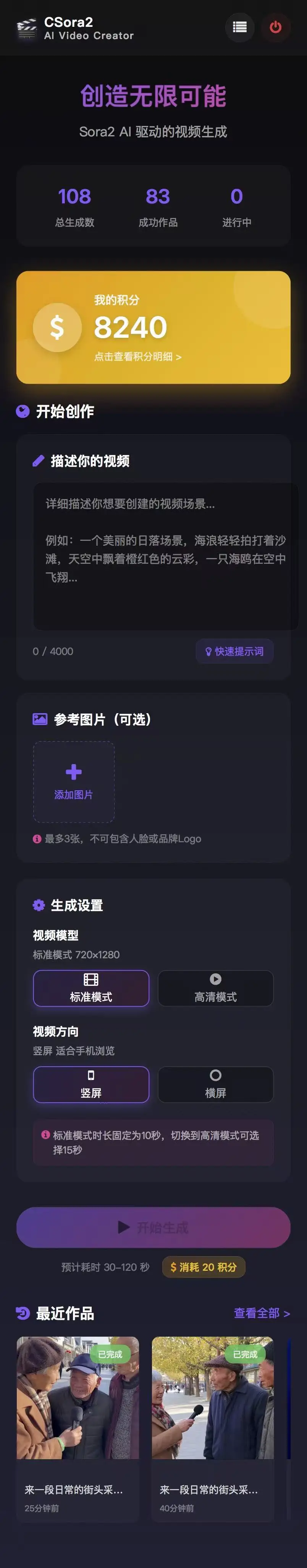 CSora2 是一款基于 Sora API 的专业 AI 视频生成应用,采用黑色炫酷风格设计,为用户提供简单易用的文字转视频创作体验。