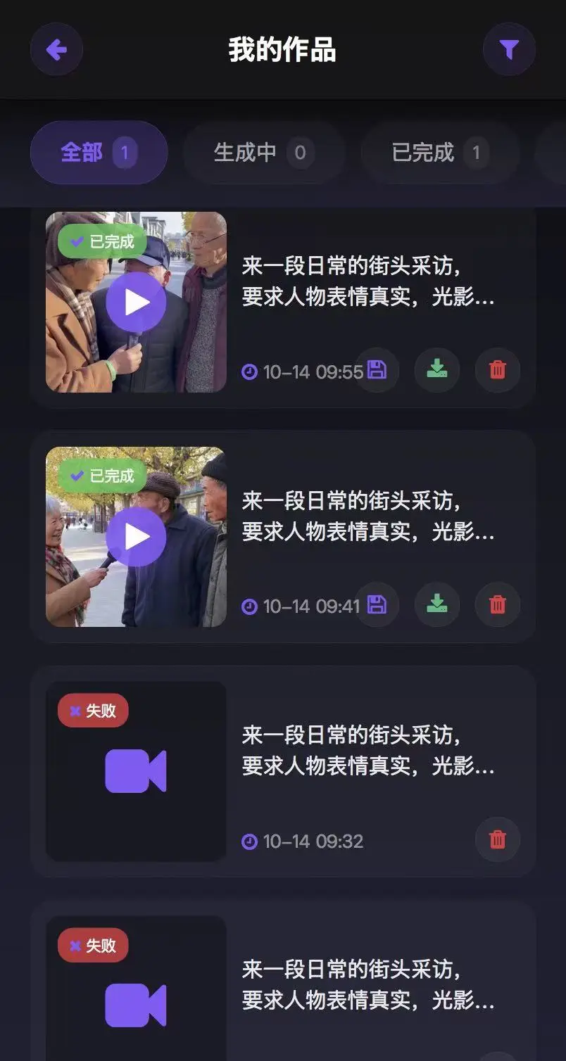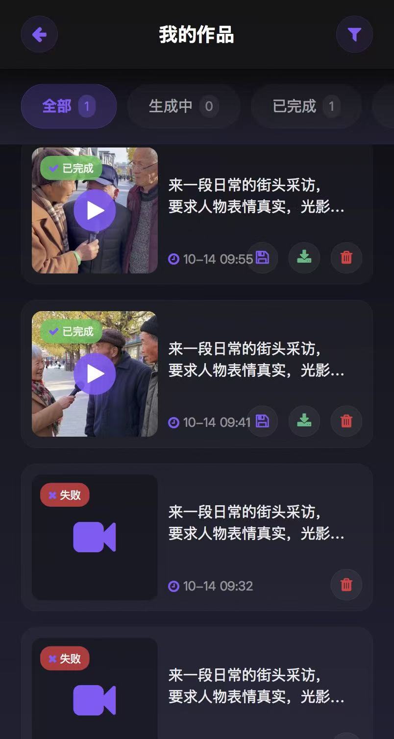 - 状态筛选:全部/生成中/已完成/失败