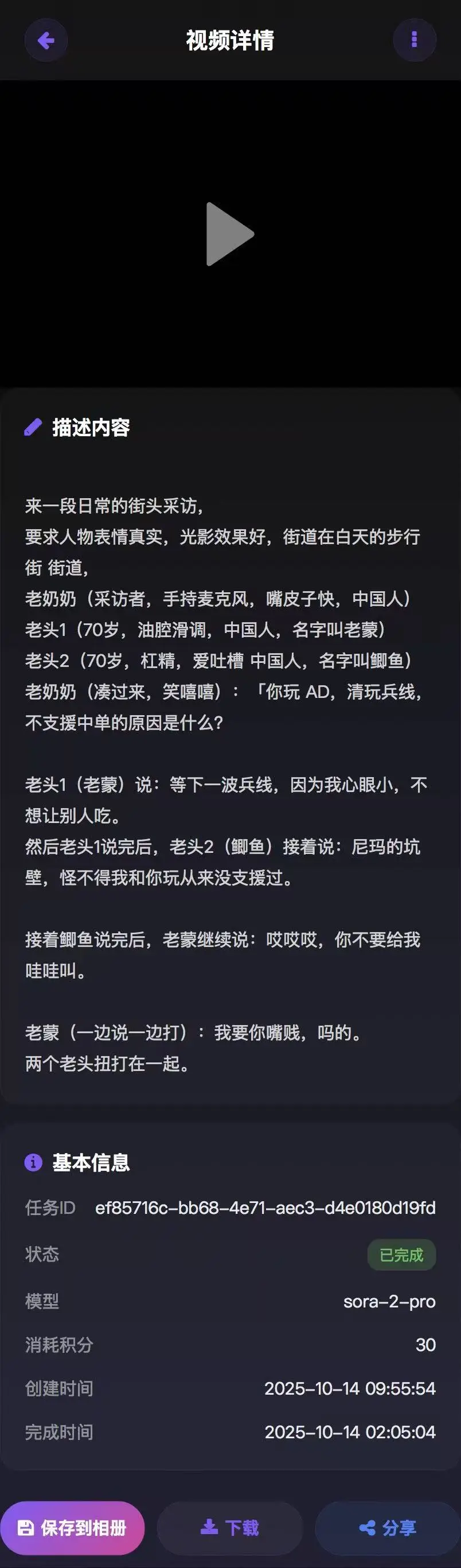 - 详细信息:展示 Prompt、参考图片、生成参数