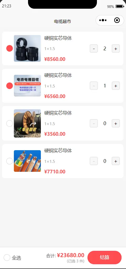 商品列表展示(包含图片、名称、规格、价格) 单个商品选中 / 取消选中 全选 / 取消全选功能 商品数量增减(最低 1 件) 实时计算选中商品的数量和总价 购物车为空时的友好提示 结算功能(跳转到结算页面)