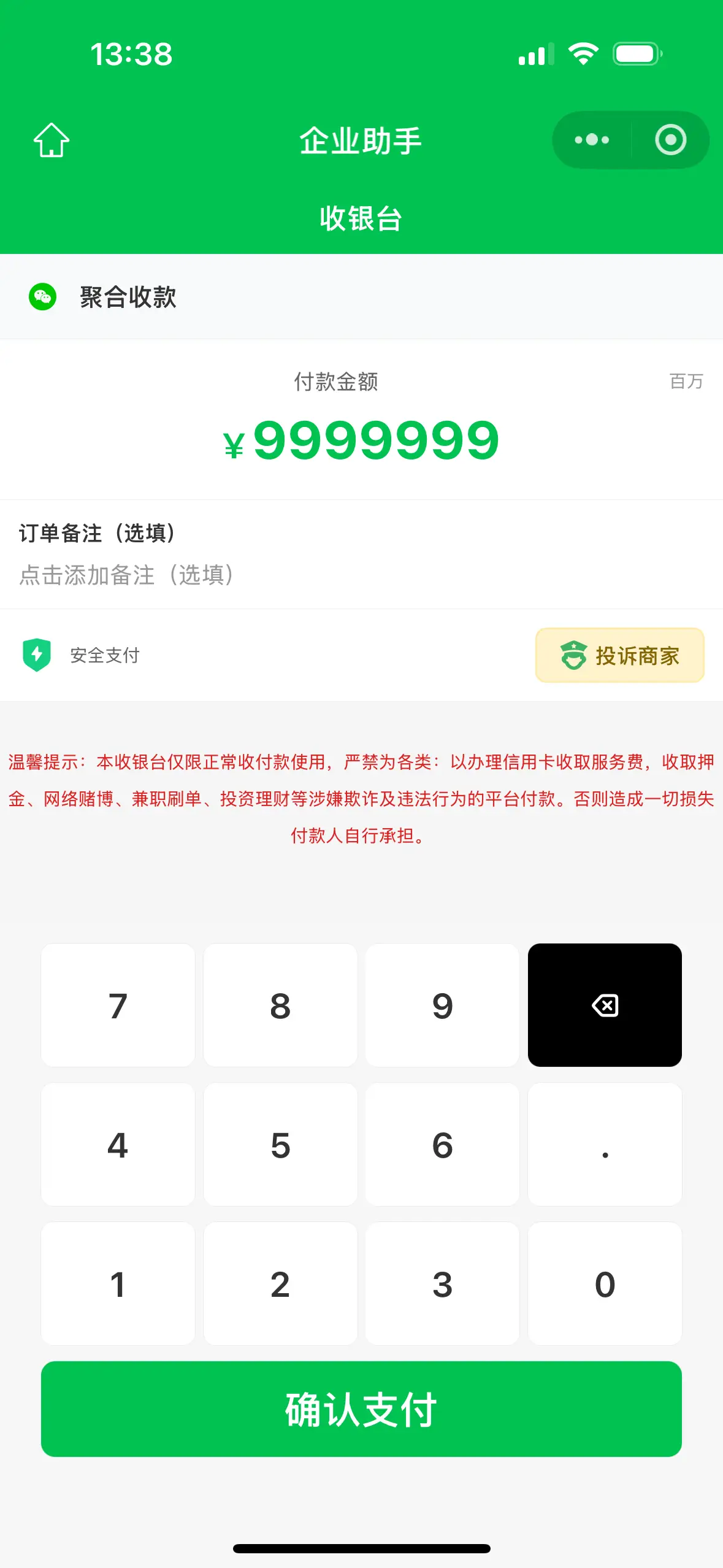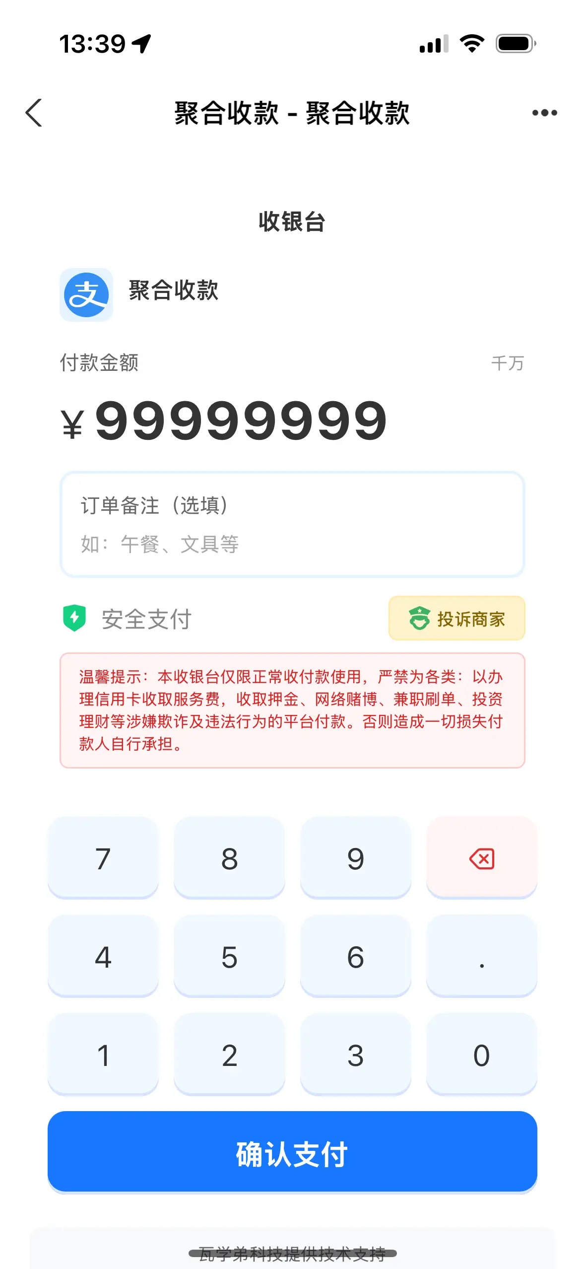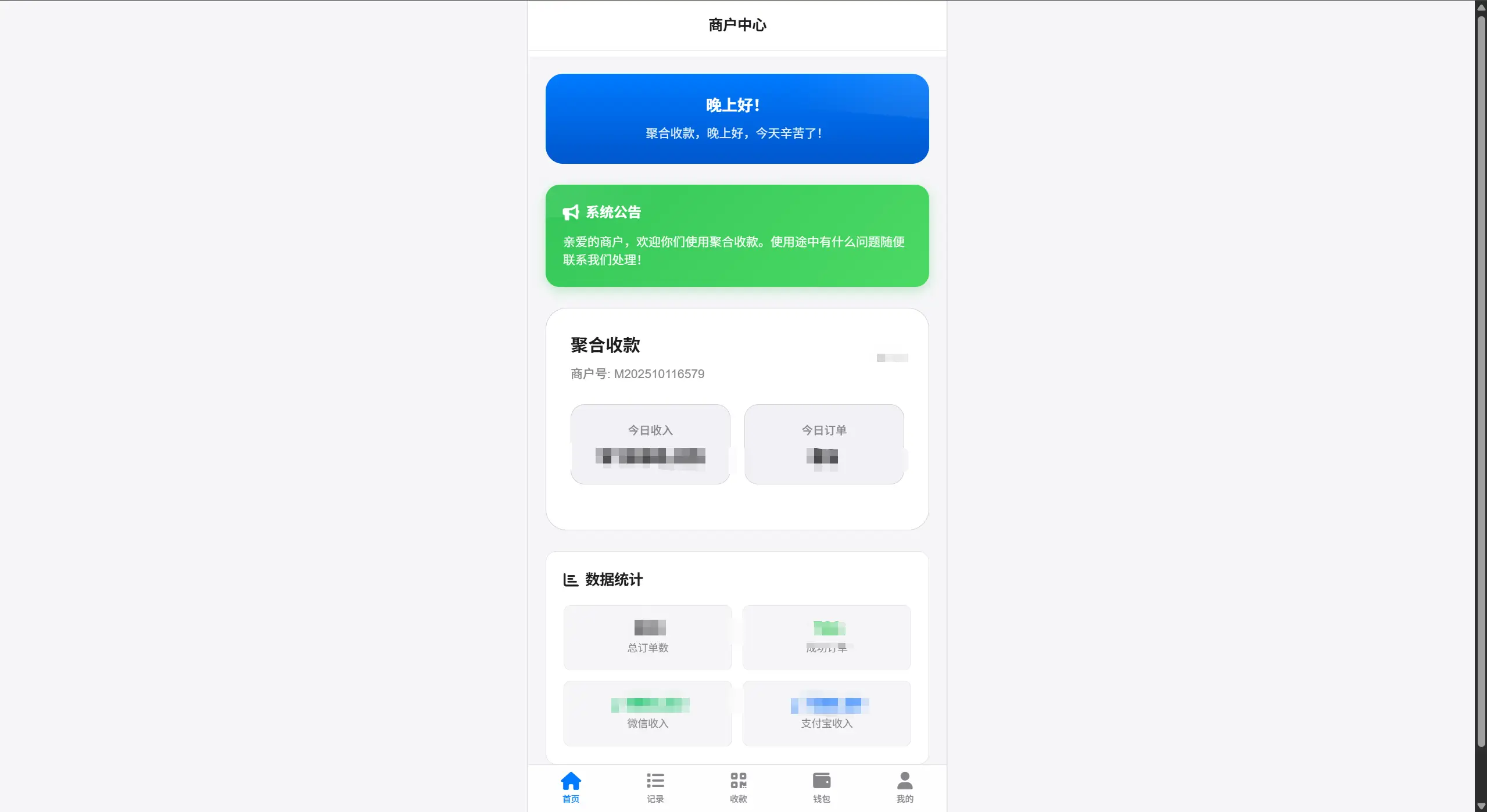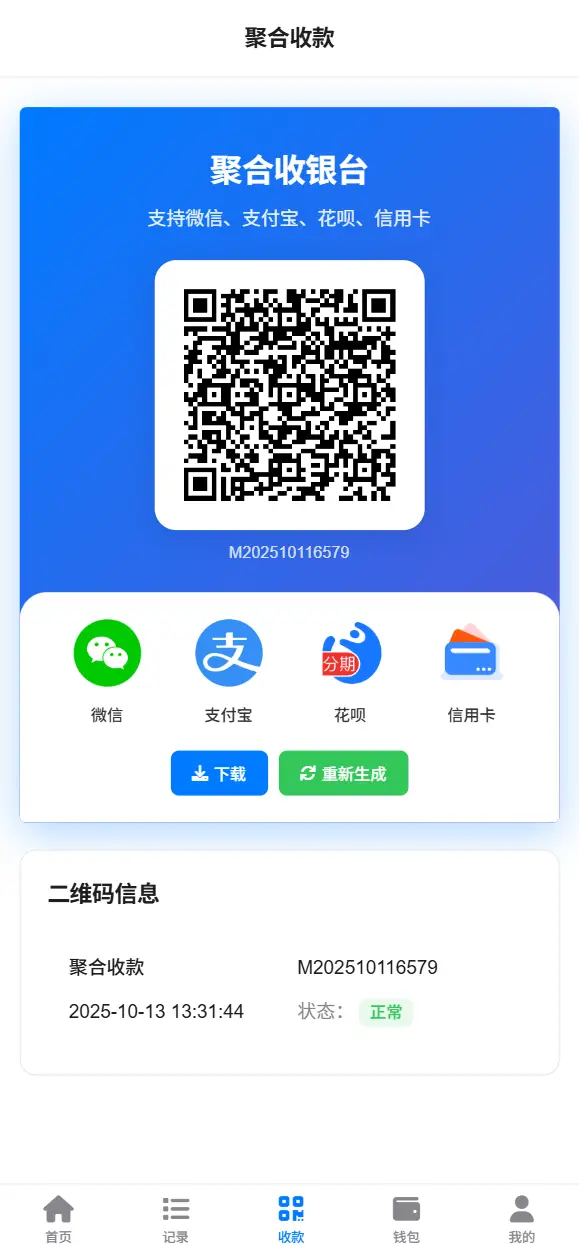 管理员后台: 管理员登录(带验证码保护) 商户管理(审核、封号、解封) 订单管理(查看、导出、统计) 结算管理(提现审核、手续费计算) 投诉处理(处理用户投诉) 系统配置(费率、公告、参数设置) 商户端: 商户注册(实名认证 + 人脸识别) 商户登录(带验证码保护) 收款二维码生成 订单查看和统计 钱包管理(余额、提现) 个人设置