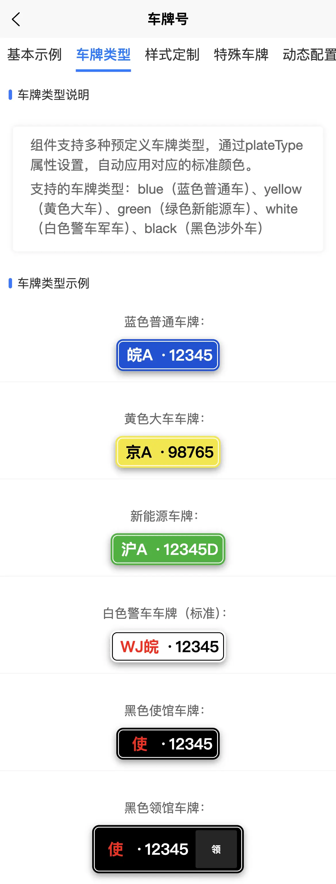 plateType | String | 'blue' | 车牌类型,可选值:blue(蓝牌)、yellow(黄牌)、green(新能源)、white(白牌)、black(黑牌) |