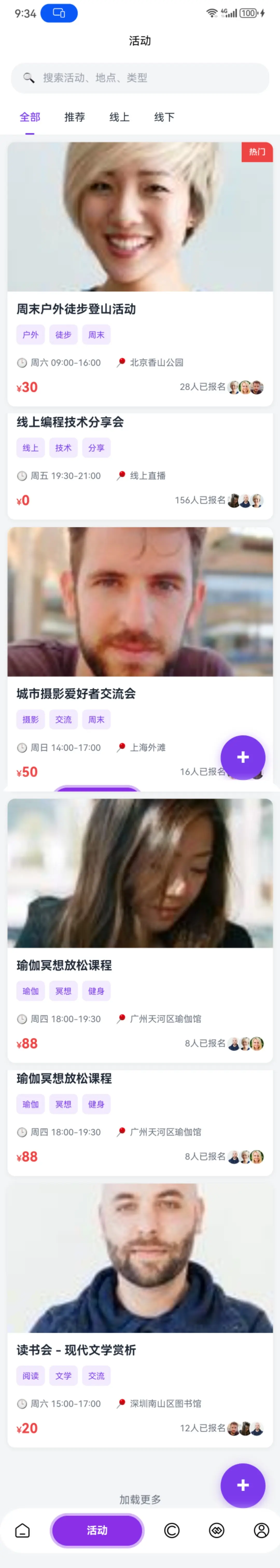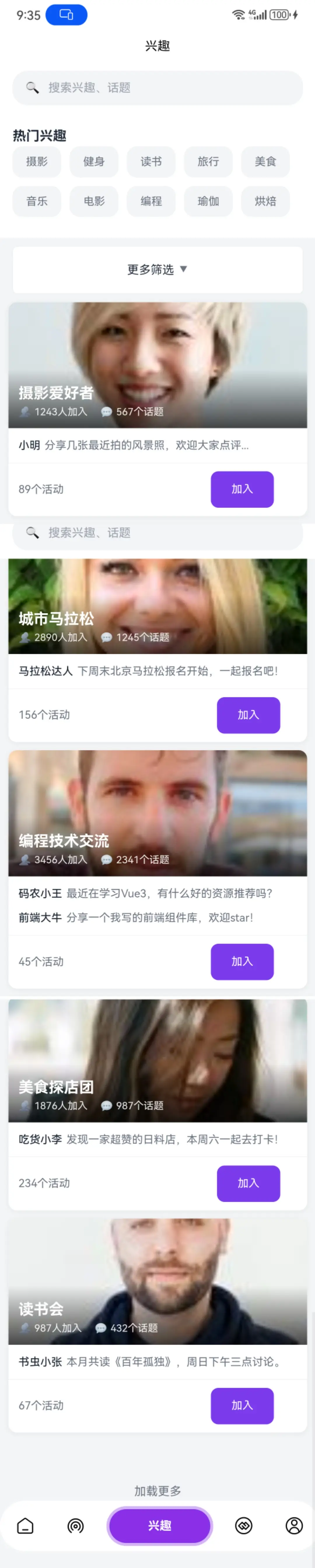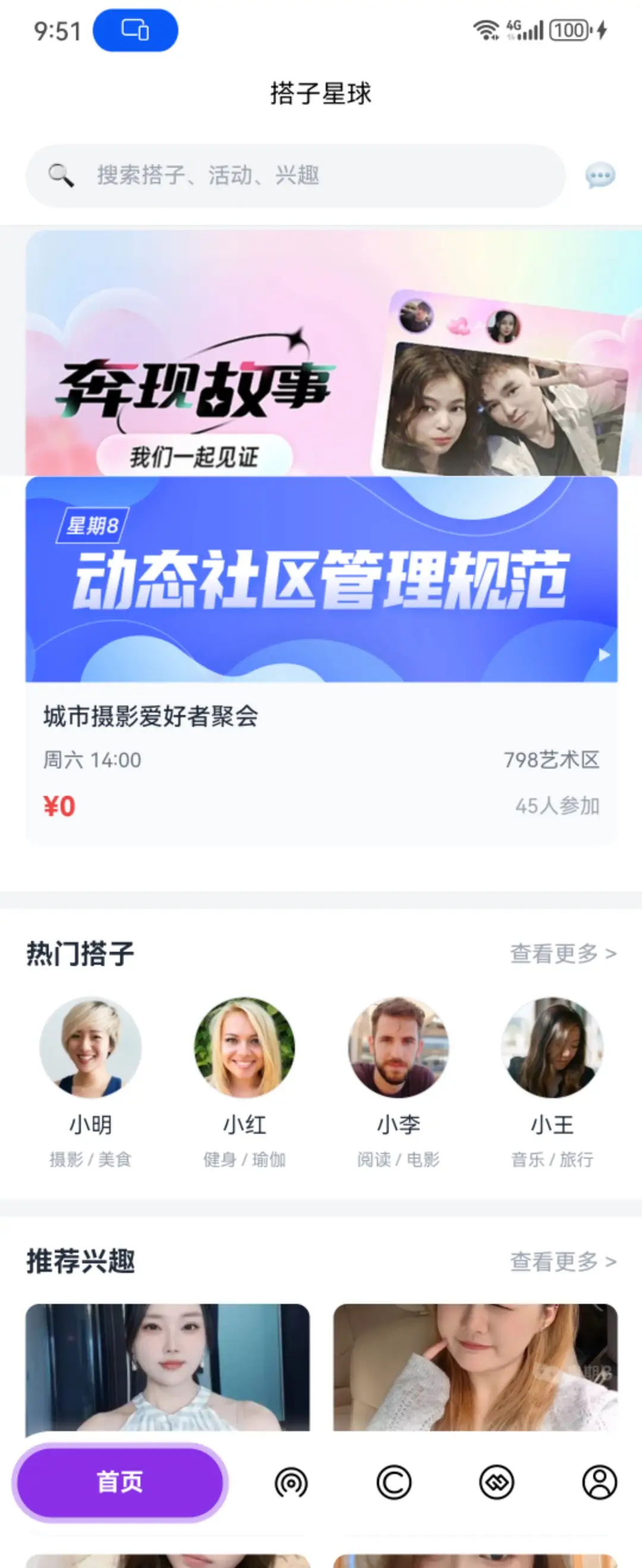 - 首页:推荐活动,热门搭子,推荐兴趣,搜索。