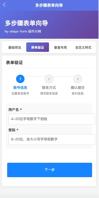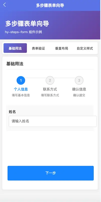 hy-steps-form 是一个功能强大、灵活易用的多步骤表单向导组件,专为 uni-app 开发。支持自定义步骤内容、表单验证、步骤跳转等功能,适用于用户注册、信息填写、订单提交等多步骤流程场景。