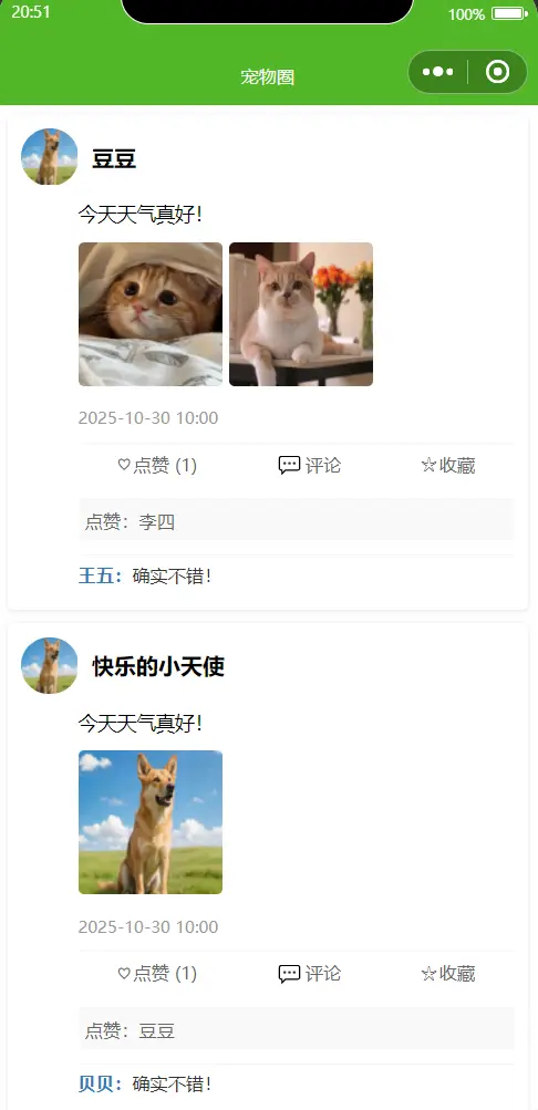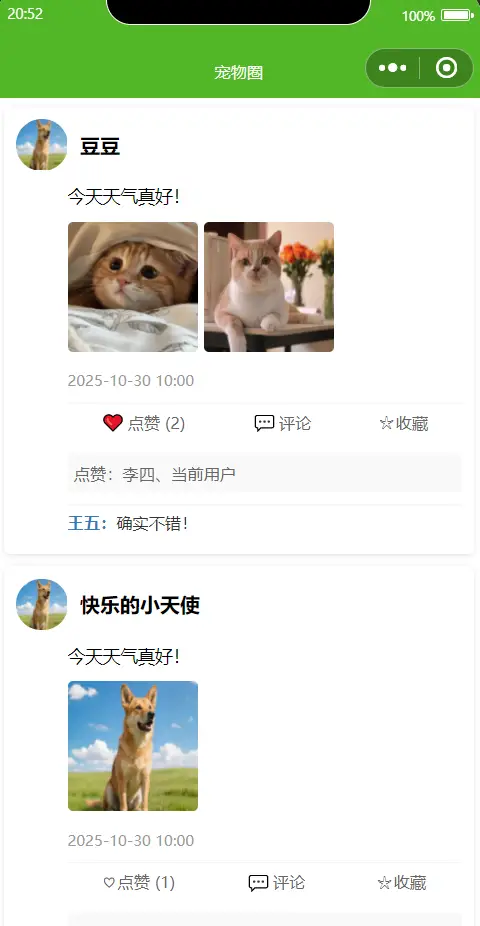 实际项目中,需将操作通过 uni.request 同步到后端接口(如点赞 / 评论 / 收藏的 API)。 页面初始化时,从接口拉取最新的朋友圈数据(包含点赞、评论、收藏状态)。