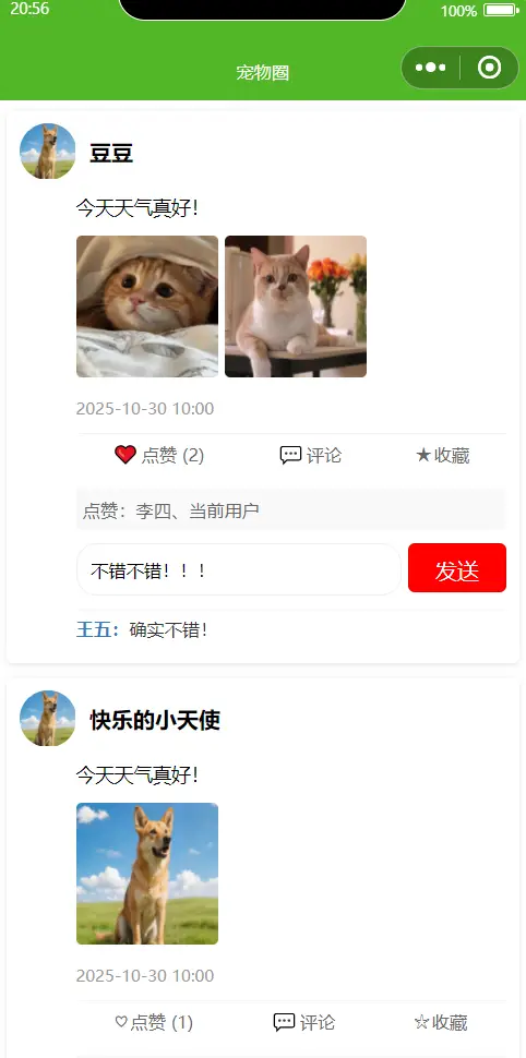 在 UniApp 中实现朋友圈的评论、点赞、收藏功能,核心是通过 数据绑定 + 事件交互 + 状态管理 实现,并结合本地存储或接口请求持久化数据。