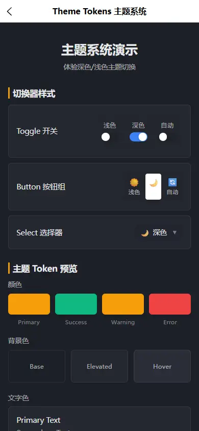 UniApp 主题管理组件,支持深色/浅色主题切换、自定义主题色、跟随系统主题。