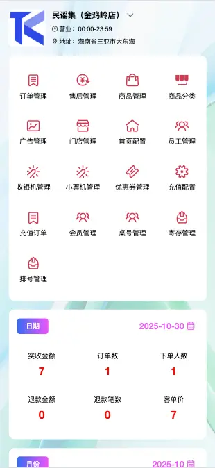2)商家管理系统(小程序) 商家中心:商家管理模块,商家营销数据 订单管理:订单列表,订单详情,修改状态 售后管理:售后列表,售后详情,审核订单 商品管理:商品管理增删查改 商品分类:商品分类增删查改 广告管理:首页轮播图和弹窗广告增删改 门店管理:添加连锁管理门店 小程序首页配置 员工管理:员工管理增删查改(列表,详情,删除) 收银机管理:收银机增删查改(列表,详情,删除) 小票机管理:小票机增删查改(列表,详情,删除) 优惠券管理:优惠券增删查改(列表,详情,删除,作废,领取列表) 充值配置:小程序充值管理配置 充值管理:充值列表,退款充值订单 会员管理:会员列表,余额明细,操作余额