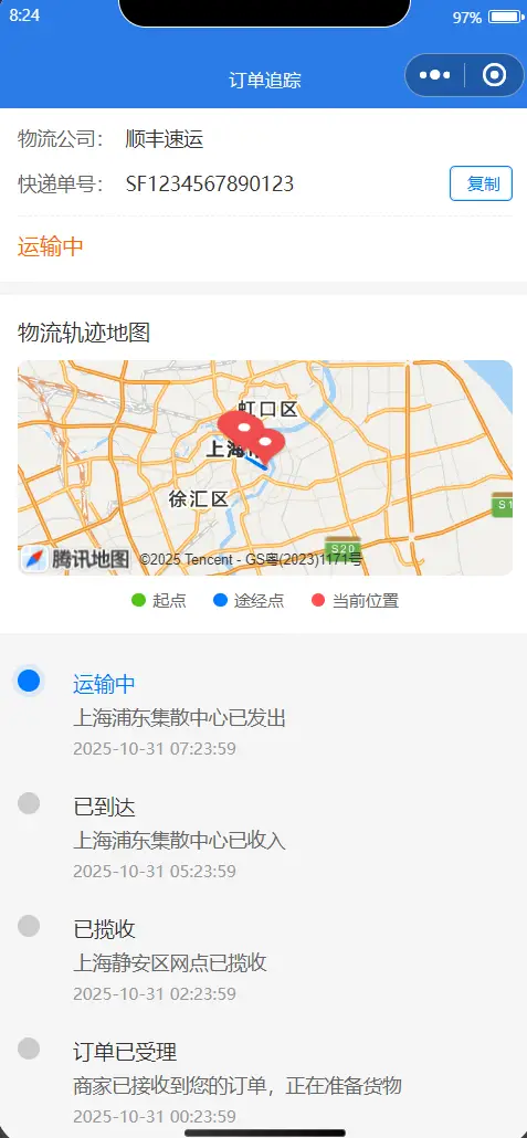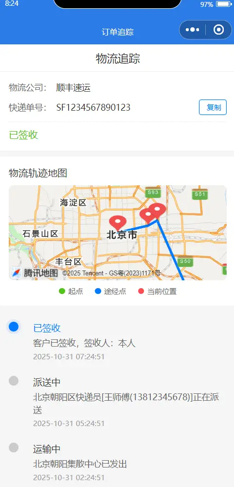 如果要对接真实接口,只需修改 generateMockData 方法,从接口获取包含经纬度的物流数据,然后调用 generateMapData 方法更新地图展示。 这个实现不仅提供了传统的物流时间轴追踪,还通过地图可视化直观展示了包裹的运输路线,让用户能更清晰地了解物流进度。