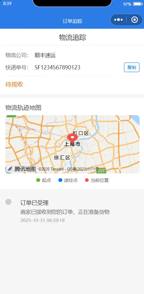 map-marker-green.png(起点标记) map-marker-blue.png(途经点标记) map-marker-red.png(当前位置标记) 页面跳转:从订单页面跳转时传递物流参数: