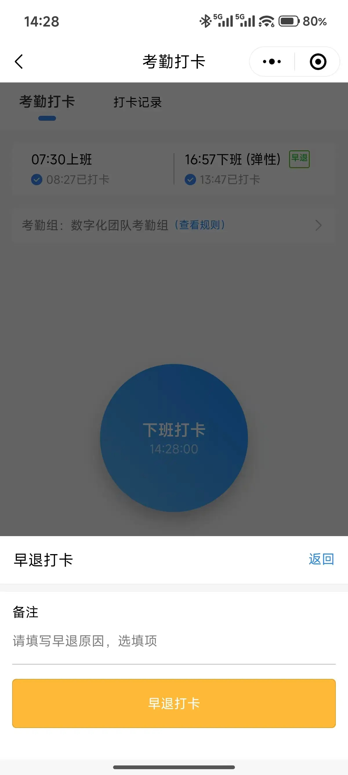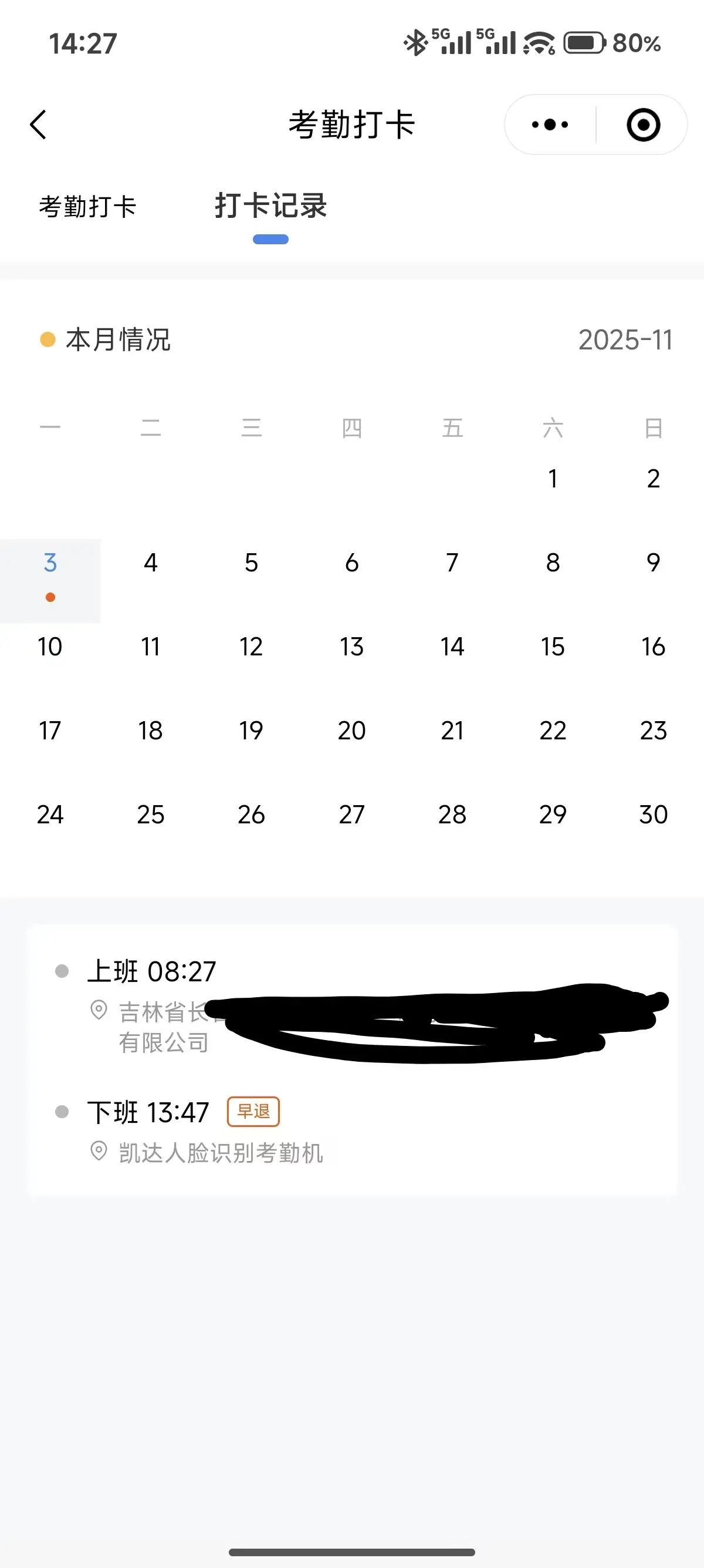 页面实现了打卡雷达动画,轮询定位,页面停留时间检测,迟到早退状态检测,打卡记录日历查看功能。