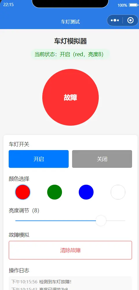 模拟车灯开关状态(开启 / 关闭) 模拟车灯颜色切换(红 / 绿 / 蓝 / 白) 模拟亮度调节(1-10 级) 模拟车灯故障状态(随机触发) 实时显示车灯当前状态信息